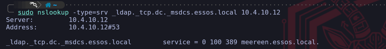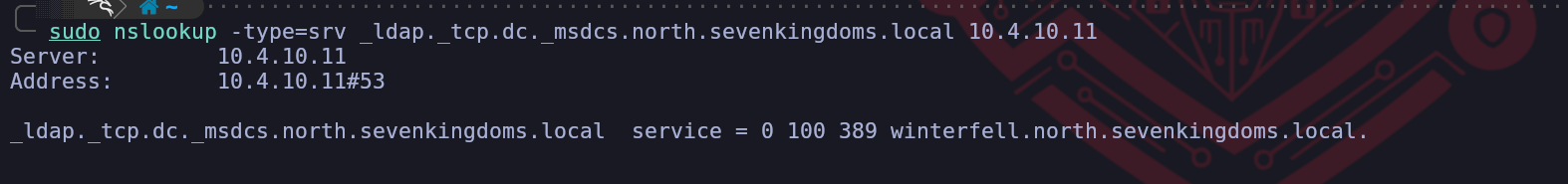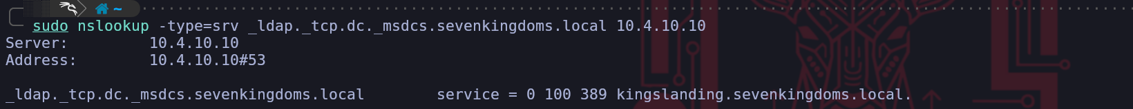 nslookup.sudo nslookup -type=srv _ldap._tcp.dc._msdcs.sevenkingdoms.local 10.4.10.10sudo nslookup -type=srv _ldap._tcp.dc._msdcs.north.sevenkingdoms.local 10.4.10.11sudo nslookup -type=srv _ldap._tcp.dc._msdcs.essos.local 10.4.10.12The specific query asks for a service record under a very precise naming convention. The part that reads