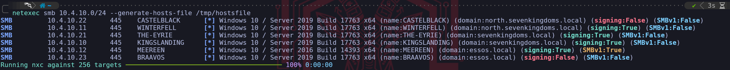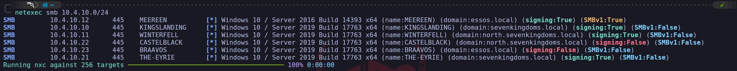 This confirms we are not dealing with a simple flat network, but a hierarchy where pivoting and cross-domain escalation will be key components of our operational path.Furthermore, we can perform immediate role identification by analyzing the SMB Signing status of each host. In a default Active Directory environment, Microsoft mandates that Domain Controllers require SMB Signing to prevent Man-in-the-Middle attacks against the directory's integrity. Therefore, we can infer that Kingslanding, Winterfell, and Meereen all showing
