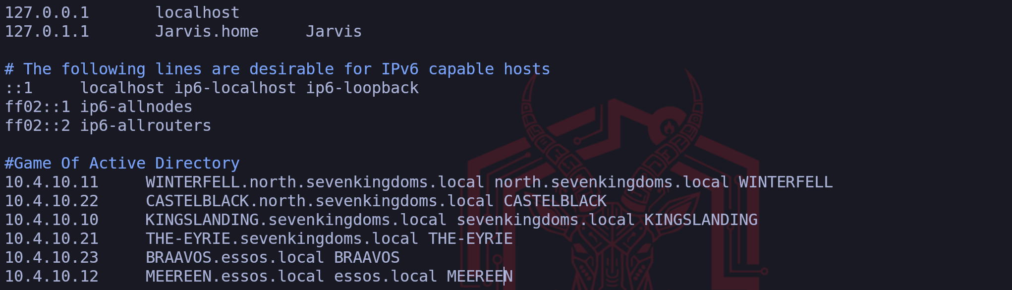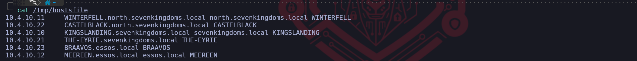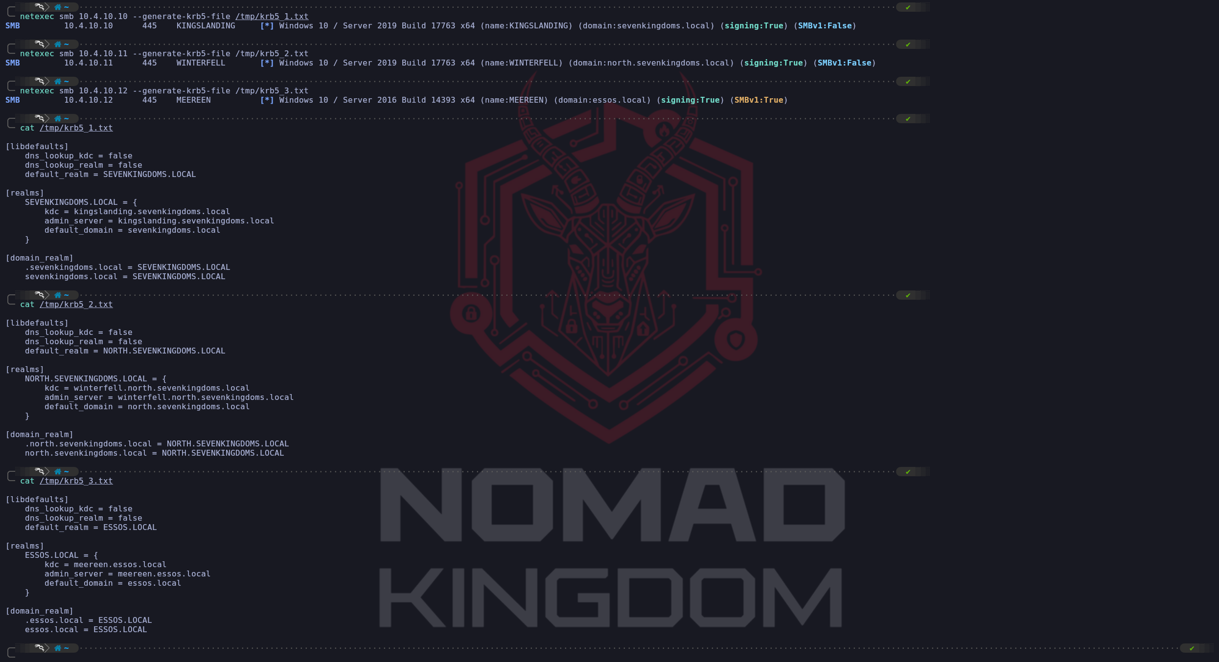 /etc/krb5.conffile like this:vim /etc/krb5.conf[libdefaults] dns_lookup_kdc = false dns_lookup_realm = false default_realm = ESSOS.LOCAL [realms] SEVENKINGDOMS.LOCAL = { kdc = kingslanding.sevenkingdoms.local admin_server = kingslanding.sevenkingdoms.local default_domain = sevenkingdoms.local } NORTH.SEVENKINGDOMS.LOCAL = { kdc = winterfell.north.sevenkingdoms.local admin_server = winterfell.north.sevenkingdoms.local default_domain = north.sevenkingdoms.local } ESSOS.LOCAL = { kdc = meereen.essos.local admin_server = meereen.essos.local default_domain = essos.local } [domain_realm] .sevenkingdoms.local = SEVENKINGDOMS.LOCAL sevenkingdoms.local = SEVENKINGDOMS.LOCAL .north.sevenkingdoms.local = NORTH.SEVENKINGDOMS.LOCAL north.sevenkingdoms.local = NORTH.SEVENKINGDOMS.LOCAL .essos.local = ESSOS.LOCAL essos.local = ESSOS.LOCALNow that we do have Kerberos Client installed and well configured, lets move on.