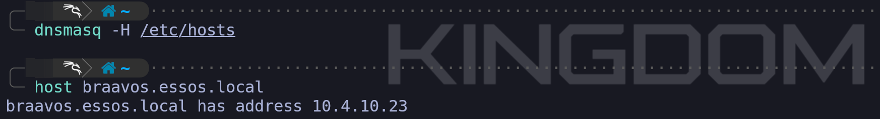 hostsfile anddnsmasqto create a manual map of the network because this allows us to use domain names instead of raw IP addresses. This is critical because many services and exploits we use will fail if we cannot resolve the correct hostnames for the domain controllers.We need to setup a local DNS in linux by configuring /etc/hosts. We can do it manually, but instead of that, we can also use NetExec