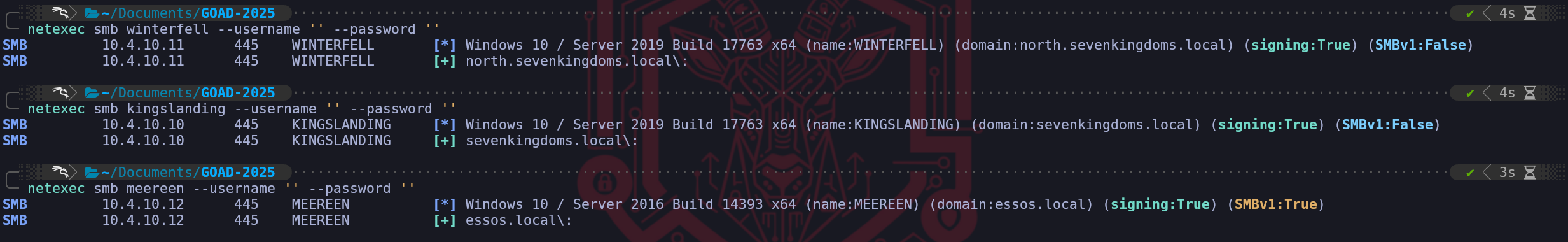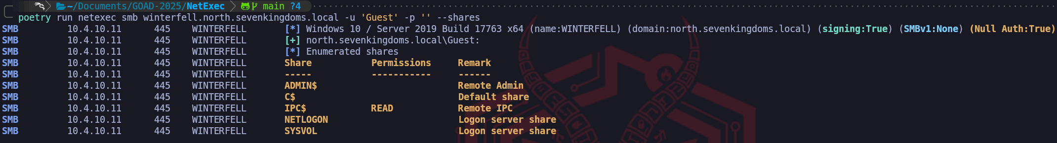 nxc smb <IP> -u 'guest' -p '', we can instantly visualize which machines have the guest account enabled and, more importantly, whether that account has the permission to list shares. A successful result here is indicated by the "Pwn3d!" or "Read" label in the output, which serves as an immediate signal to stop broad scanning and begin deep, surgical extraction of that specific machine.poetry run netexec smb winterfell.north.sevenkingdoms.local -u 'Guest' -p ''When we find a machine that responds positively to guest or null credentials, as we can see above screenshot containing the [+] for Guest account, we transition to the Samba suite.