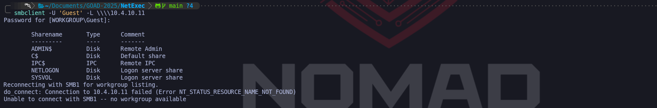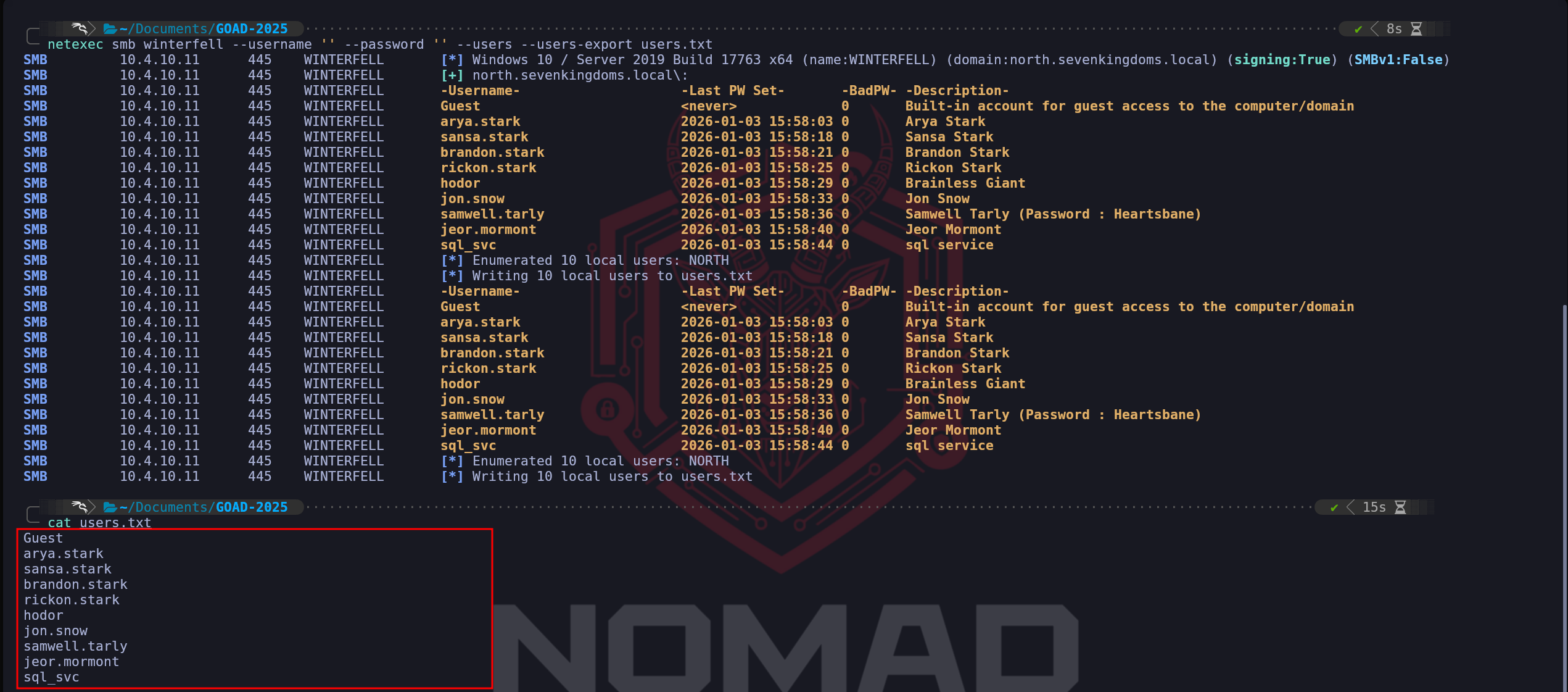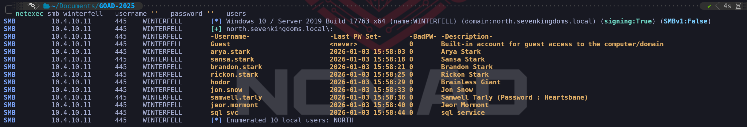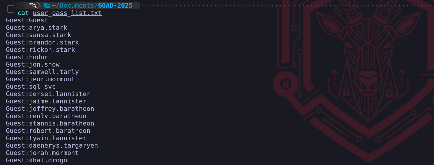 By default we do not have this condition in GOAD, but we can be easily enabled using the same method we did during theEnumerate Guest logonphase.Enable-ADAccount -Identity GuestSet-ItemProperty -Path "HKLM:\\SYSTEM\\CurrentControlSet\\Services\\LanmanWorkstation\\Parameters" -Name "AllowInsecureGuestLogon" -Value 1Once we satisfy those initial conditions, tools like NetExec or the Impacket suite will handle the automation of these requests, allowing us to generate a definitive list of users, their primary groups, and their associated descriptions directly from the Security Accounts Manager.