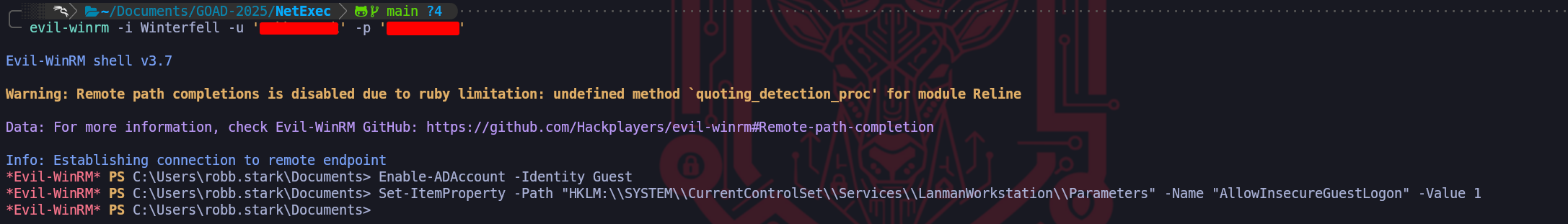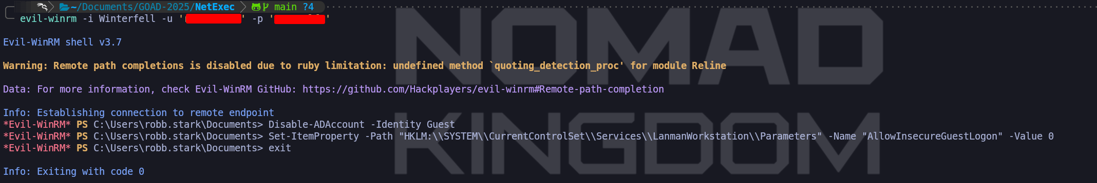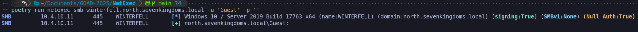 AllowInsecureGuestLogon. We can set this globally through a Group Policy Object or apply it directly to the local registry for immediate effect on Winterfell. We execute the following command in PowerShell:Set-ItemProperty -Path "HKLM:\\SYSTEM\\CurrentControlSet\\Services\\LanmanWorkstation\\Parameters" -Name "AllowInsecureGuestLogon" -Value 1. We may also need to apply similar changes to the LanmanServer service to ensure the listener is willing to map anonymous incoming packets to the newly enabled Guest identity.Enable-ADAccount -Identity GuestSet-ItemProperty -Path "HKLM:\\SYSTEM\\CurrentControlSet\\Services\\LanmanWorkstation\\Parameters" -Name "AllowInsecureGuestLogon" -Value 1We are intentionally breaking the defense-in-depth model that makes unauthenticated SMB access so difficult in 2025. After these modifications are complete, our subsequent NetExec scans will no longer return the