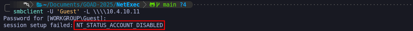 Once the machine is back online, we will execute our verification check using NetExec to confirm that we see the return of theSTATUS_ACCOUNT_DISABLEDerror.smbclient -U 'Guest' -L \\\\10.4.10.11Seeing that specific error once again marks our successful conclusion of this phase. We have proven that without administrative intervention, a modern Windows Server remains resistant to guest-based attacks. We are now back to our secure baseline where unauthenticated access to the
