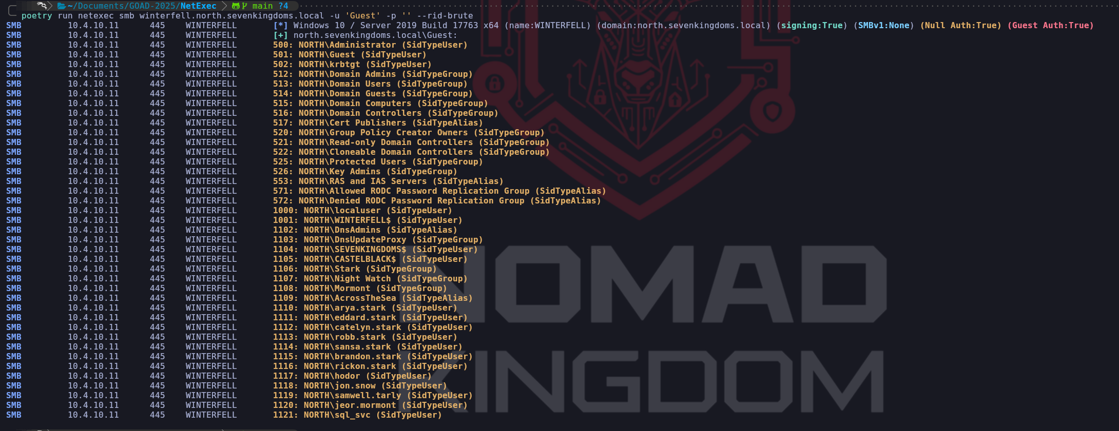 poetry run netexec smb winterfell.north.sevenkingdoms.local -u 'Guest' -p '' --rid-bruteEnumerating with Impacket-lookupsid