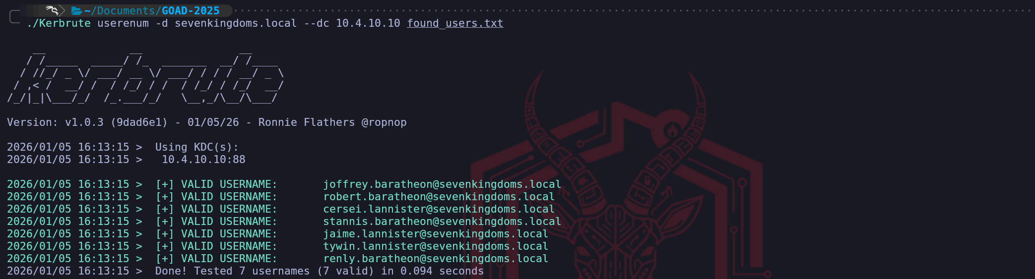 ./Kerbrute userenum -d sevenkingdoms.local --dc 10.4.10.10 found_users.txtAs we can see on the screenshot above, In sevenkingdoms.local domain we were able to find out 7 more users by bruteforcing the authentication using the users we found.