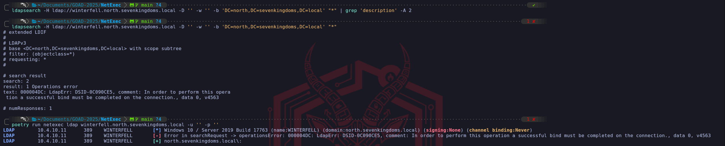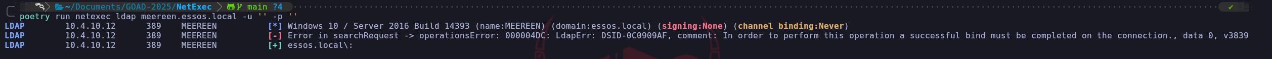 poetry run netexec ldap meereen.essos.local -u '' -p ''This side-by-side comparison provides a perfect laboratory visualization of how Active Directory security policies manifest at the protocol level. We can see exactly how the Domain Controller behaves when it is defending itself versus when we have successfully manipulated its configuration. When we look at the first output for Meereen (Essos), we see a somewhat contradictory result that requires a high-level understanding of how NetExec interacts with the LDAP service. The tool shows a red error message indicating an
