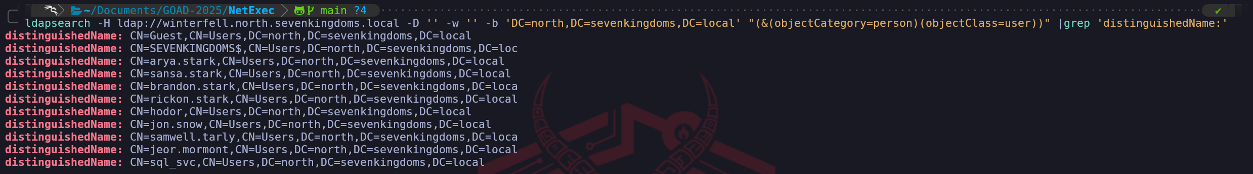 |grep 'distinguishedName:'concatenated with ldapsearch as well, we end up getting a list of users based on their DistinguishedName attribute. Note: We need to be aware that when passing these attributes, the capitalization matters, if we passDistinguishedNameinstead ofdistinguishedNameon our grep command, the query will fail sinceDistinguishedNameis not a valid attribute.ldapsearch -H ldap://winterfell.north.sevenkingdoms.local -D '' -w '' -b 'DC=north,DC=sevenkingdoms,DC=local' "(&(objectCategory=person)(objectClass=user))" |grep 'distinguishedName:'This time we can use the next filter which is