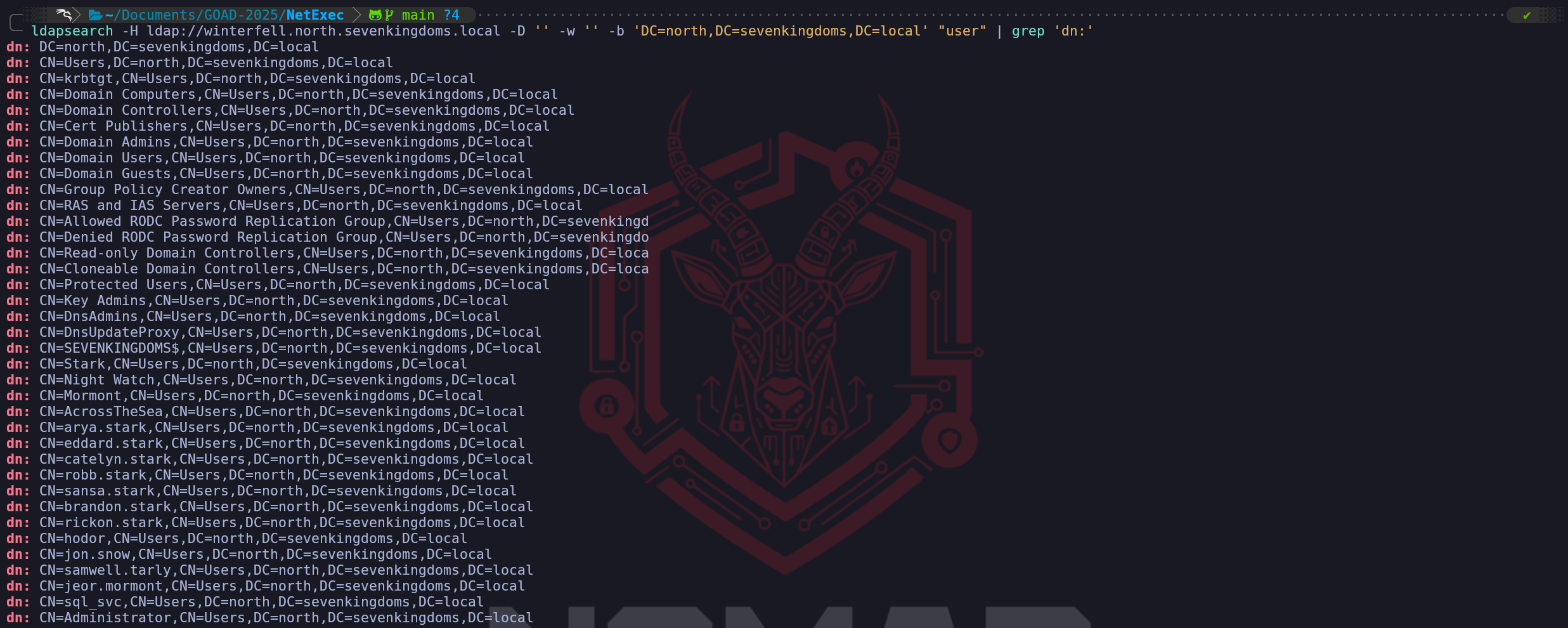 "user" | grep 'dn:', this will help us to bring the whole list of valid users and also groups as well.ldapsearch -H ldap://winterfell.north.sevenkingdoms.local -D '' -w '' -b 'DC=north,DC=sevenkingdoms,DC=local' "user" | grep 'dn:'For this last filter, but not the least important one, we can use the