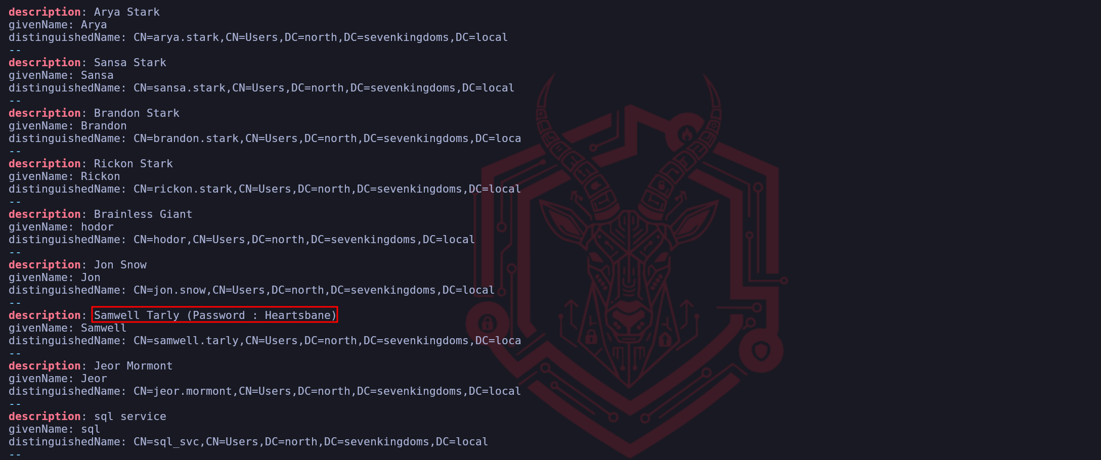 this command will bring all the objects inside the target domain, includingdescription,givenNameanddistinguishedNameas well. This filter is really important during the enumeration, as we have stated previously, sometimes many System Admins end up adding crucial information into descriptions that end up leading to be juicy information to us as attackers.ldapsearch -H ldap://winterfell.north.sevenkingdoms.local -D '' -w '' -b 'DC=north,DC=sevenkingdoms,DC=local' "*" | grep 'description' -A 2As we can see on the screenshot above, by querying the description, we were able to also find Samwell Tarly’s credential crafted in the user’s description. We have already compromised this account previously during our Null Session Enumeration as well.