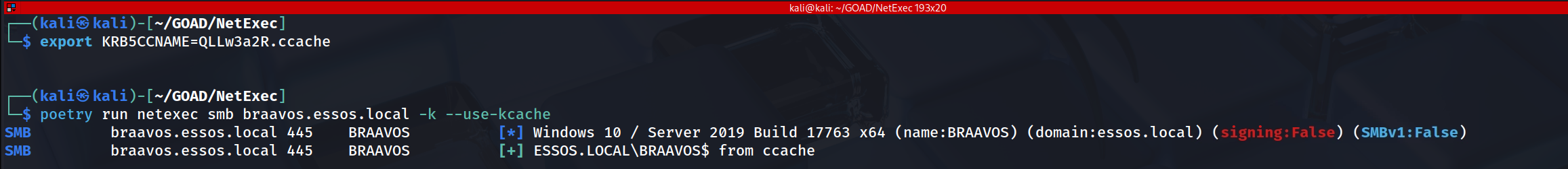 We verify our access by targeting the victim host itself using NetExec. We invoke the tool with the -k (Use Kerberos) and --use-kcache (Use the environment ticket) flags against the Fully Qualified Domain Name of Braavos. The successful output shows us authenticating as ESSOS.LOCAL\BRAAVOS$.
