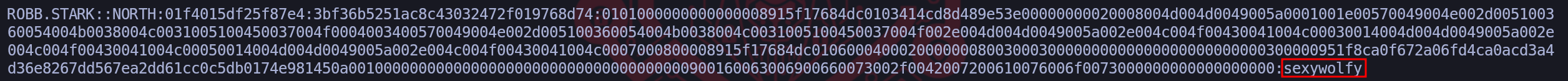 eddard.stark.[SMB] NTLMv2-SSP Client : 10.4.10.11 [SMB] NTLMv2-SSP Username : NORTH\eddard.stark [SMB] NTLMv2-SSP Hash : eddard.stark::NORTH:5320d7cf139d156b:2901B41FC44CD6B0DCBD9FAD5DB13AF8:0101000000000000008915F17684DC011555C588B1CE317B00000000020008004D004D0049005A0001001E00570049004E002D005100360054004B0038004C0031005100450037004F0004003400570049004E002D005100360054004B0038004C0031005100450037004F002E004D004D0049005A002E004C004F00430041004C00030014004D004D0049005A002E004C004F00430041004C00050014004D004D0049005A002E004C004F00430041004C0007000800008915F17684DC0106000400020000000800300030000000000000000000000000300000951F8CA0F672A06FD4CA0ACD3A4D36E8267DD567EA2DD61CC0C5DB0174E981450A001000000000000000000000000000000000000900140063006900660073002F004D006500720065006E000000000000000000Cryptographic Analysis