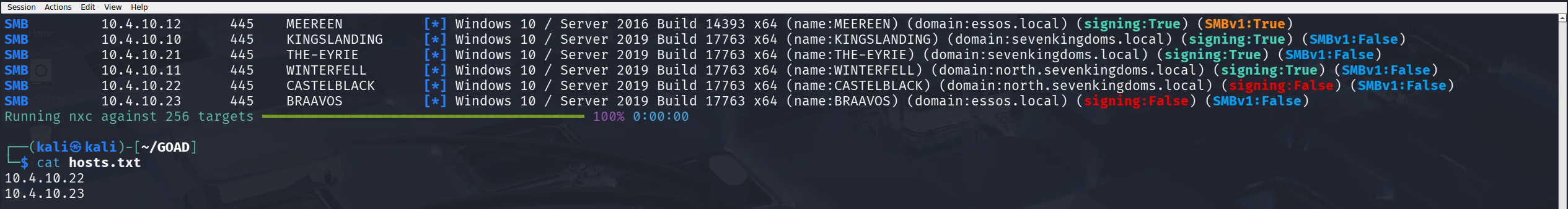 signing:True(often in green), it merely indicates that the server is capable of signing packets. It does not necessarily mean it mandates it. In a default Active Directory environment, Domain Controllers require signing (Secure), while member servers and workstations simply have it enabled (Vulnerable). If the server only "Enables" signing, our relay tool can negotiate a session protocol that simply declines to sign the packets, and the server will accept it.netexec smb 10.4.10.0/24 --gen-relay-list hostsIn our scan of the 10.4.10.0/24 subnet, NetExec automatically handles this logic for us with the