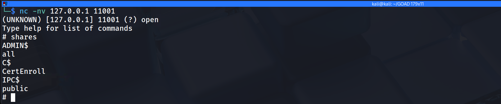 sharesto identify anduseto use the shares we want to access.nc -nv 127.0.0.1 11001