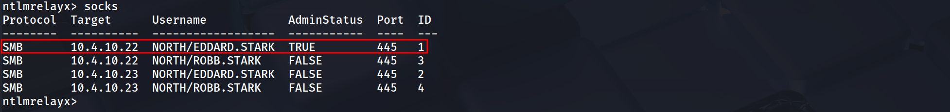 The key indicator here is the phraseAdding ... to active SOCKS connection. Enjoy.In our previous attacks, the tool grabbed the connection and either "consumed" it immediately (Option 1: Automated Secrets Dumping) or bound it to a unique, ephemeral port for a single use (Option 2: Interactive SMB Session Relaying). Here, however, impacket-ntlmrelayx is building a centralized pool of compromised sessions. It has successfully authenticated ROBB.STARK to both Castelblack (10.4.10.22) and Braavos (10.4.10.23), but instead of executing a payload, it has "parked" these authenticated sessions inside a local SOCKS4 proxy (defaulting to port 1080).