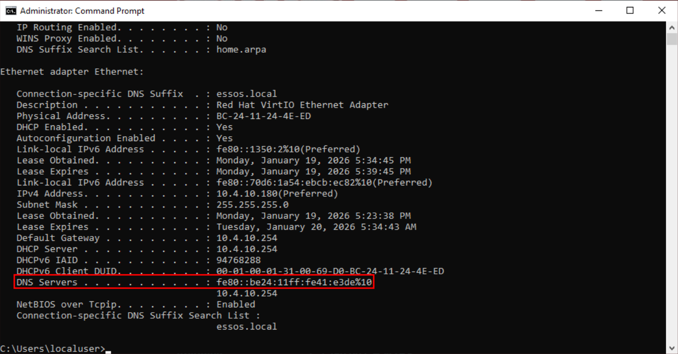 Obtain an IP address automatically, we do have setObtain DNS server address automaticallyand last but not least, theInternet Protocol Version 6is enabled as well (Which normally they are enabled by default). Once we do have this configuration done, we can simply open CMD.exe and issue the commandipconfig /renewor reboot the machine.Checking our target machine’s network configuration again after this renew or reboot, we will see that the DNS Server’s IP is now the IPv6 is the same IPv6 assigned to us when we ran