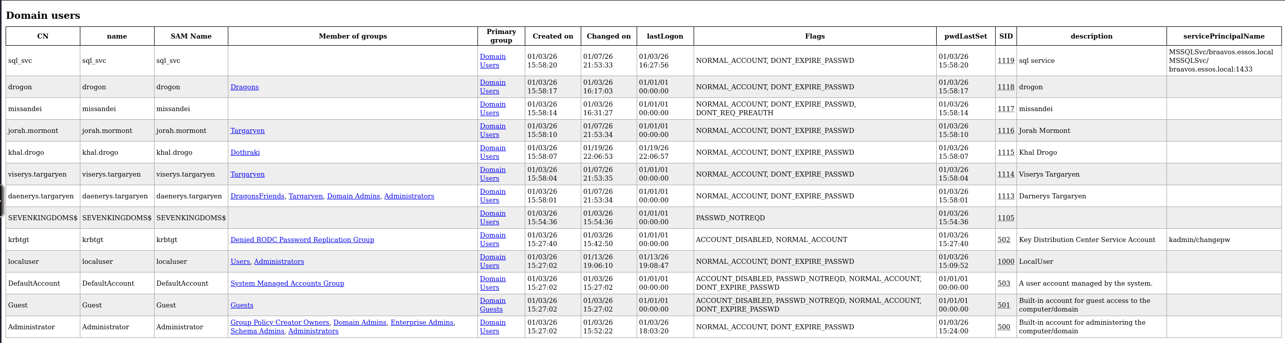 domain_users_by_group.htmlprovides a clickable roster of every user and their privileges, whiledomain_computers_by_os.htmlallows us to identify legacy operating systems (like Server 2008) that might be vulnerable to older exploits. This passive dump is often the preferred first step in a "Purple Team" or stealth-focused engagement, as reading the directory is a legitimate action that generates far fewer high-severity alerts than adding new computer accounts or modifying security descriptors. It essentially turns a single poisoned packet into a complete map of the Essos domain.We can simply now open